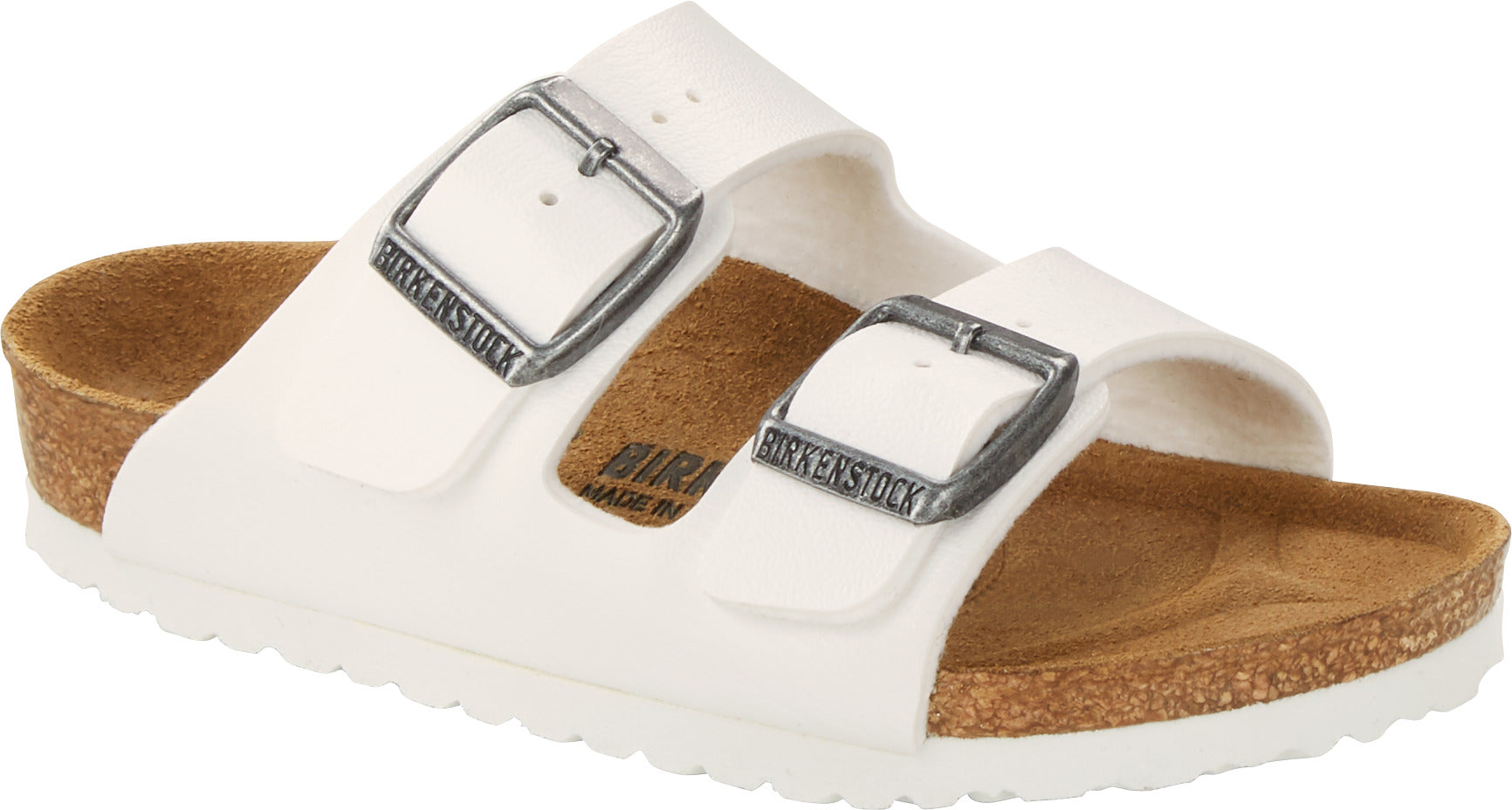 The Arizona is a classic fashion staple. Two adjustable straps in white synthetic upper material with silver buckles give a minimalist look that will match anything in your wardrobe. The style's leather footbed moulds to your foot with wear and combined with the arch support and deep heel cup make these sandals beautifully comfortable. The classic design continues with a cork footbed and lightweight EVA sole.