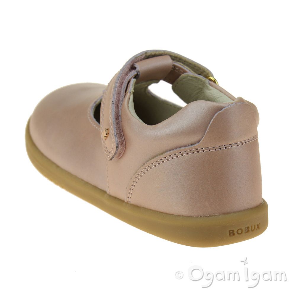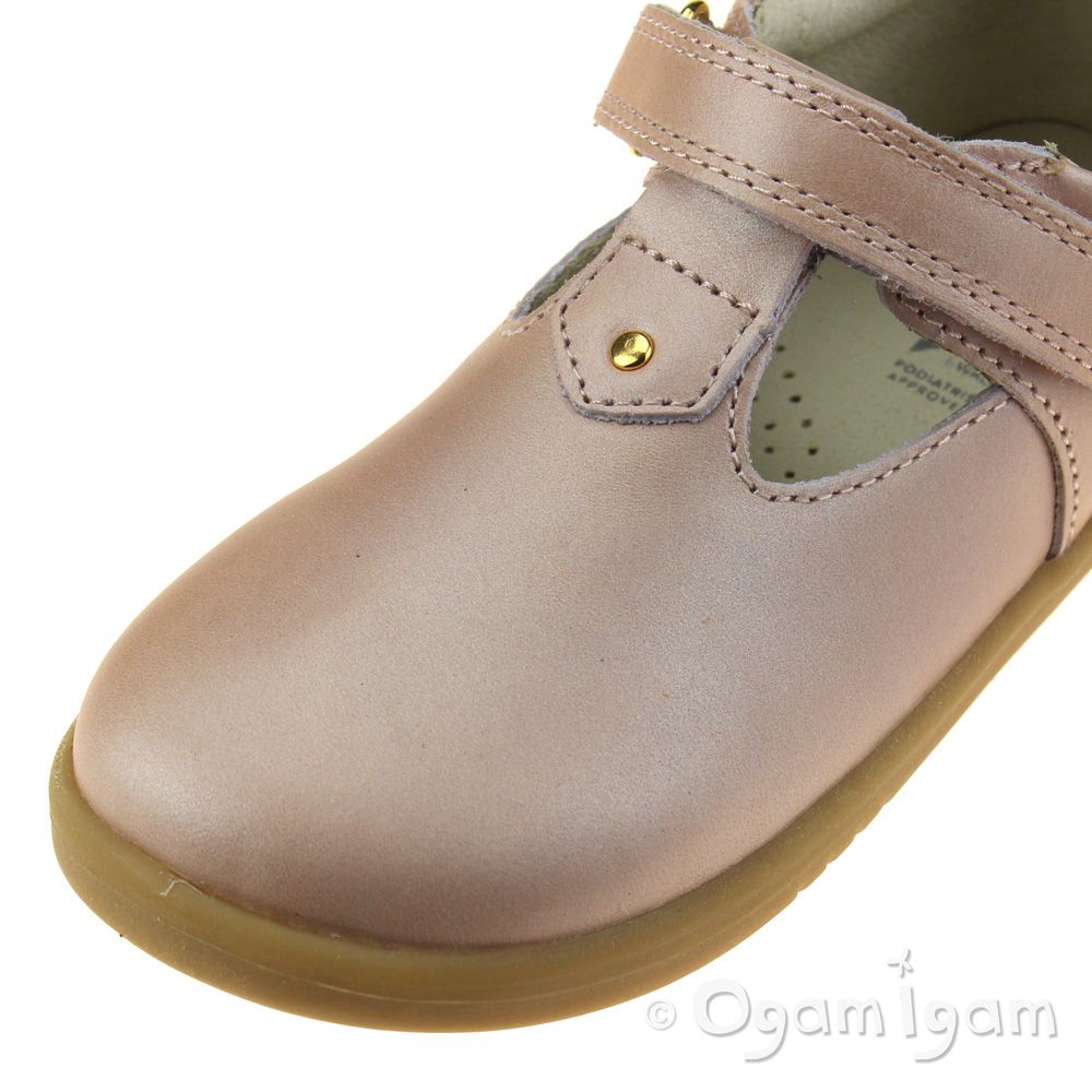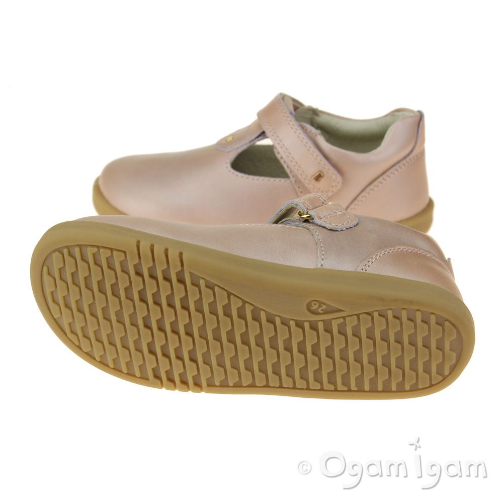 Shimmery and subtle, the Louise T-Bar girls shoes from Bobux offers style with substance. The neutral dusk pink has a delicate shimmer giving this shoe a gorgeous glowy finish. The T-Bar style is secured with a single rip-tape strap closure for an easy fit and features an all leather insole for breathability. The style's sole unit is flexible and lightweight.