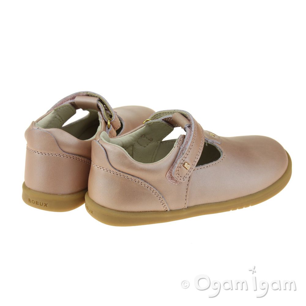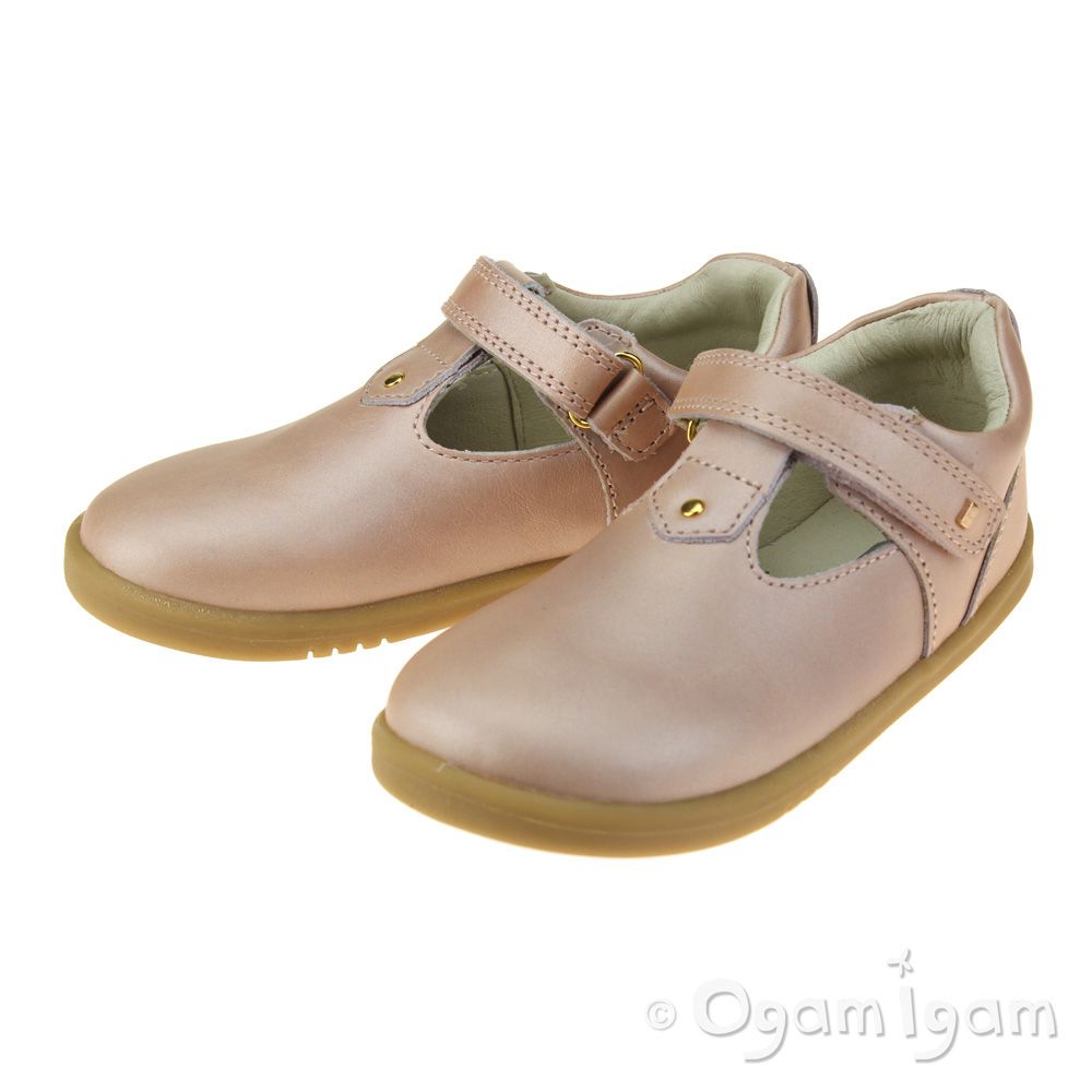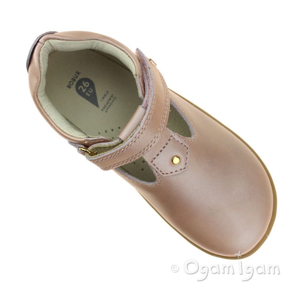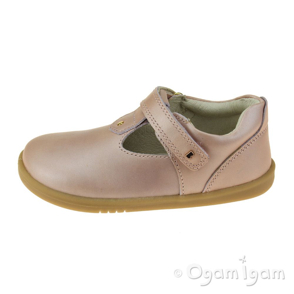 Shimmery and subtle, the Louise T-Bar girls shoes from Bobux offers style with substance. The neutral dusk pink has a delicate shimmer giving this shoe a gorgeous glowy finish. The T-Bar style is secured with a single rip-tape strap closure for an easy fit and features an all leather insole for breathability. The style's sole unit is flexible and lightweight.