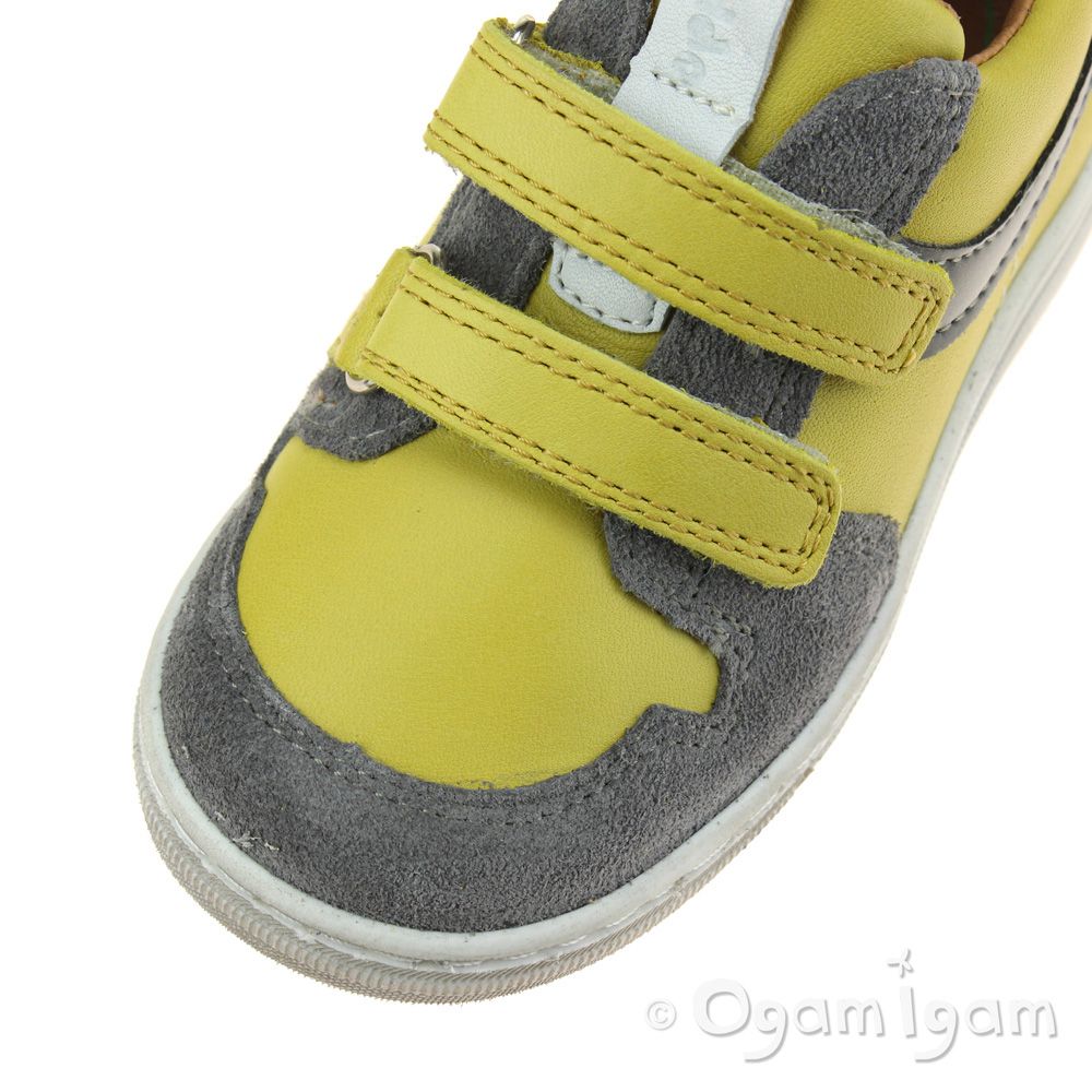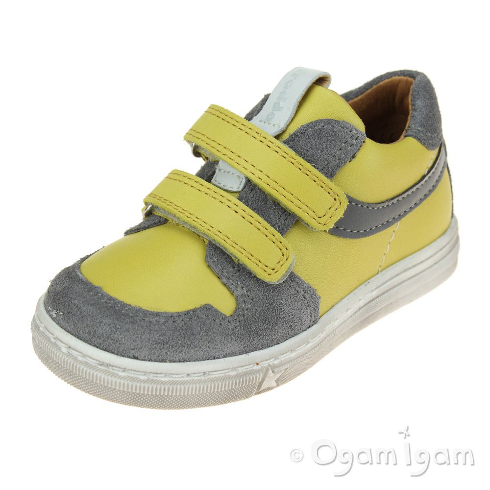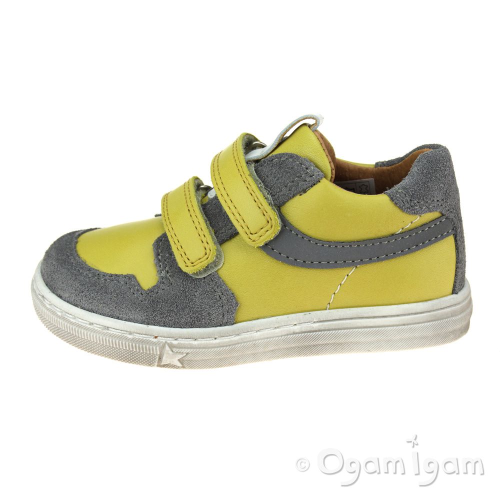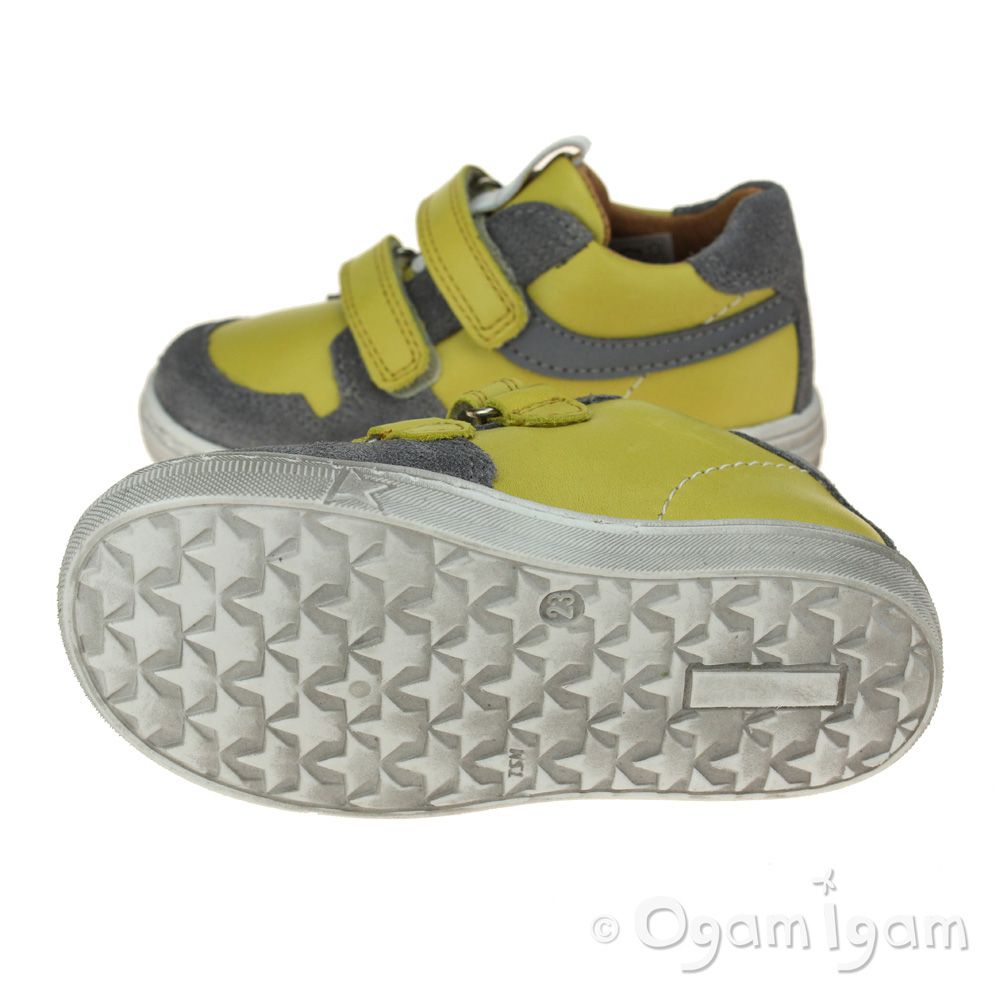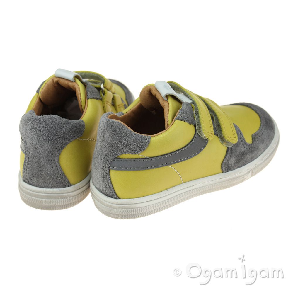 A sunshine yellow trainer style will add variety to their spring wardrobe. This leather shoe from Froddo features grey suede contrasting panels and a cool reflective strip down the side. Two rip tape straps and a padded heel collar provide support and an adjustable fit. The durable sole unit has a star print design that'll leave funky footprints in their wake! These are fully leather lined for maximum breathability.