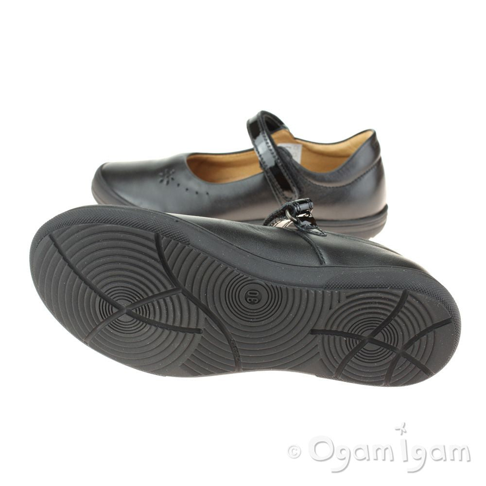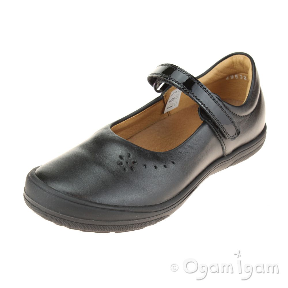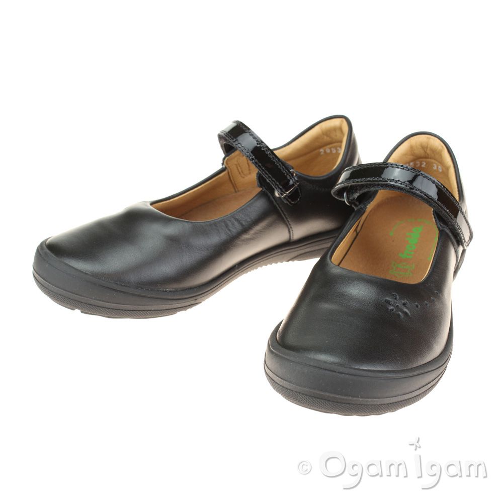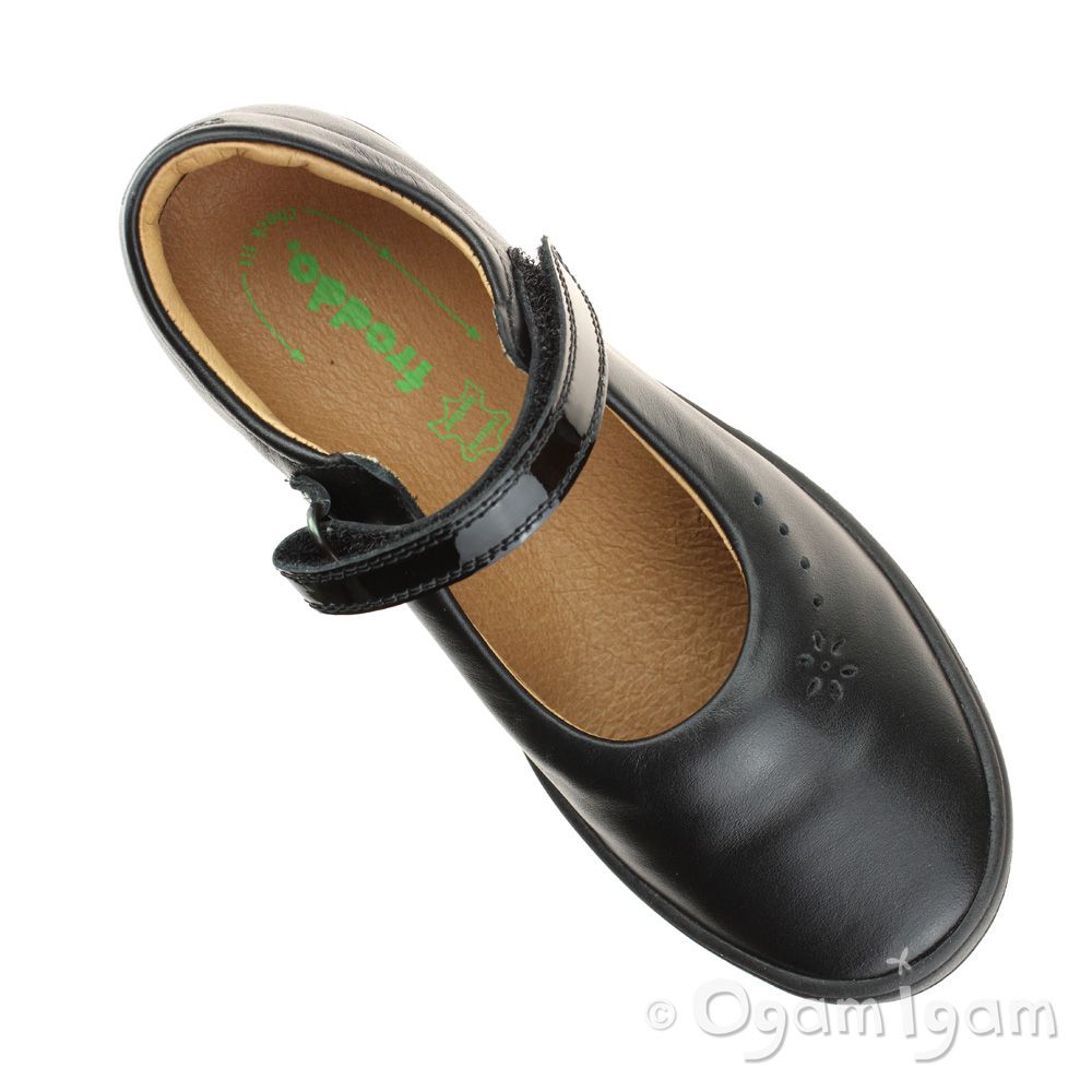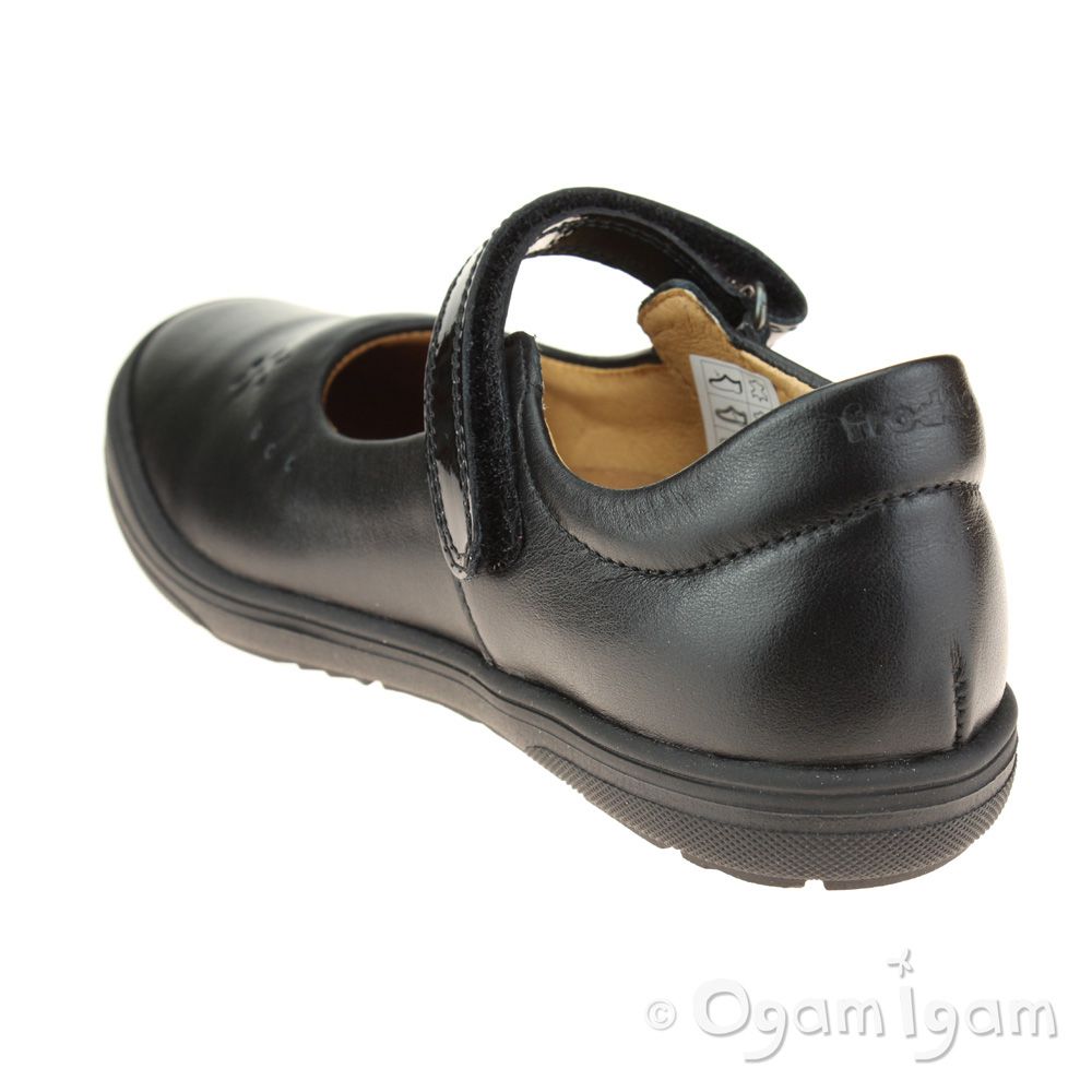 Froddo 'G3140053' style is a classic Mary Jane school shoe in black smooth leather. The soft leather upper is complimented with delicate floral detailing at the toe. The style is secured with a single adjustable rip tape strap across the ankle for simplicity, which makes it great for kids on the go. An all leather interior promotes breathability on long school days. The shoe is finished off with a strong sole unit that wraps up onto the toe to provided an extra protective 'bumper' against scuffs and scraps.