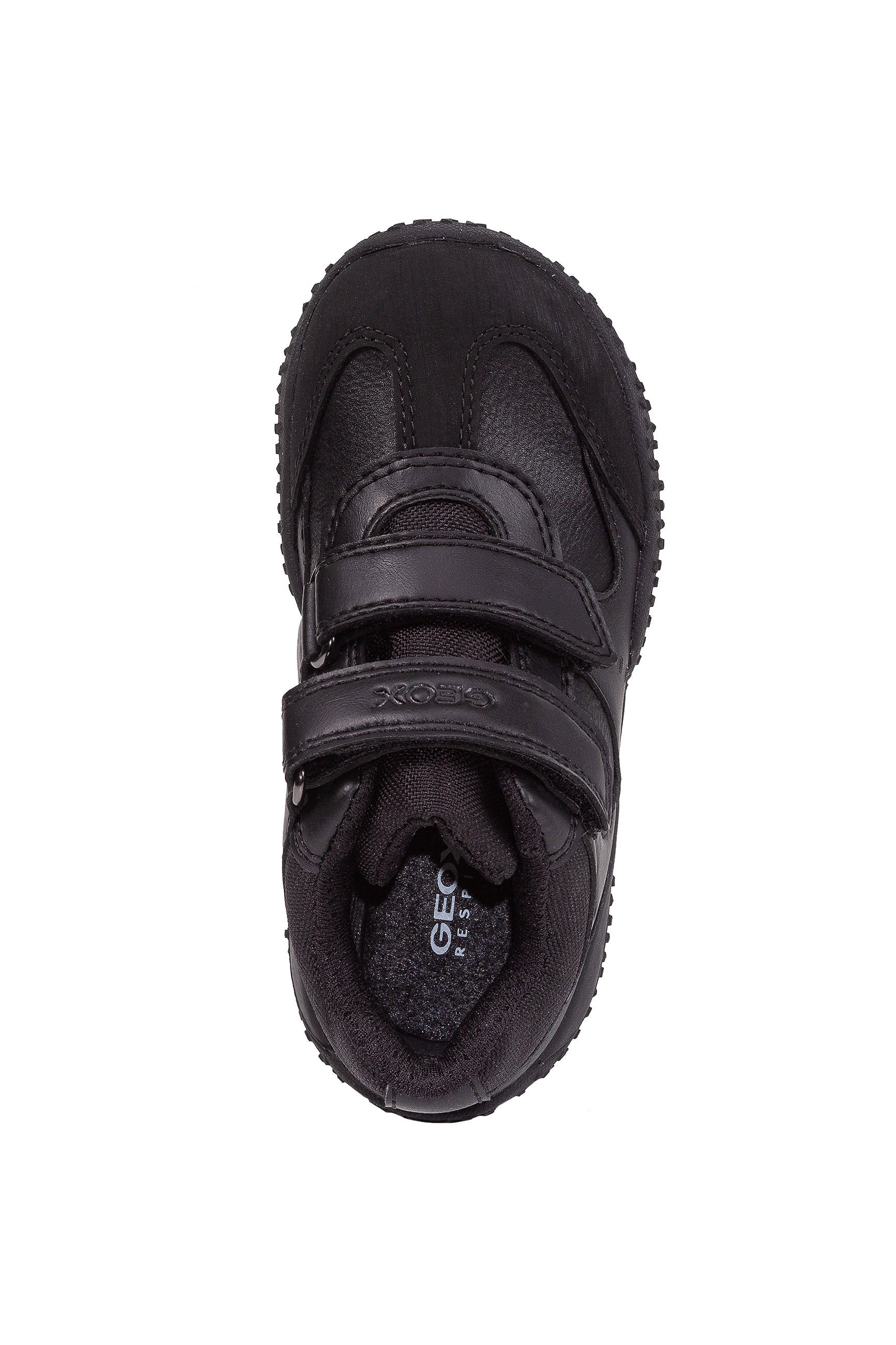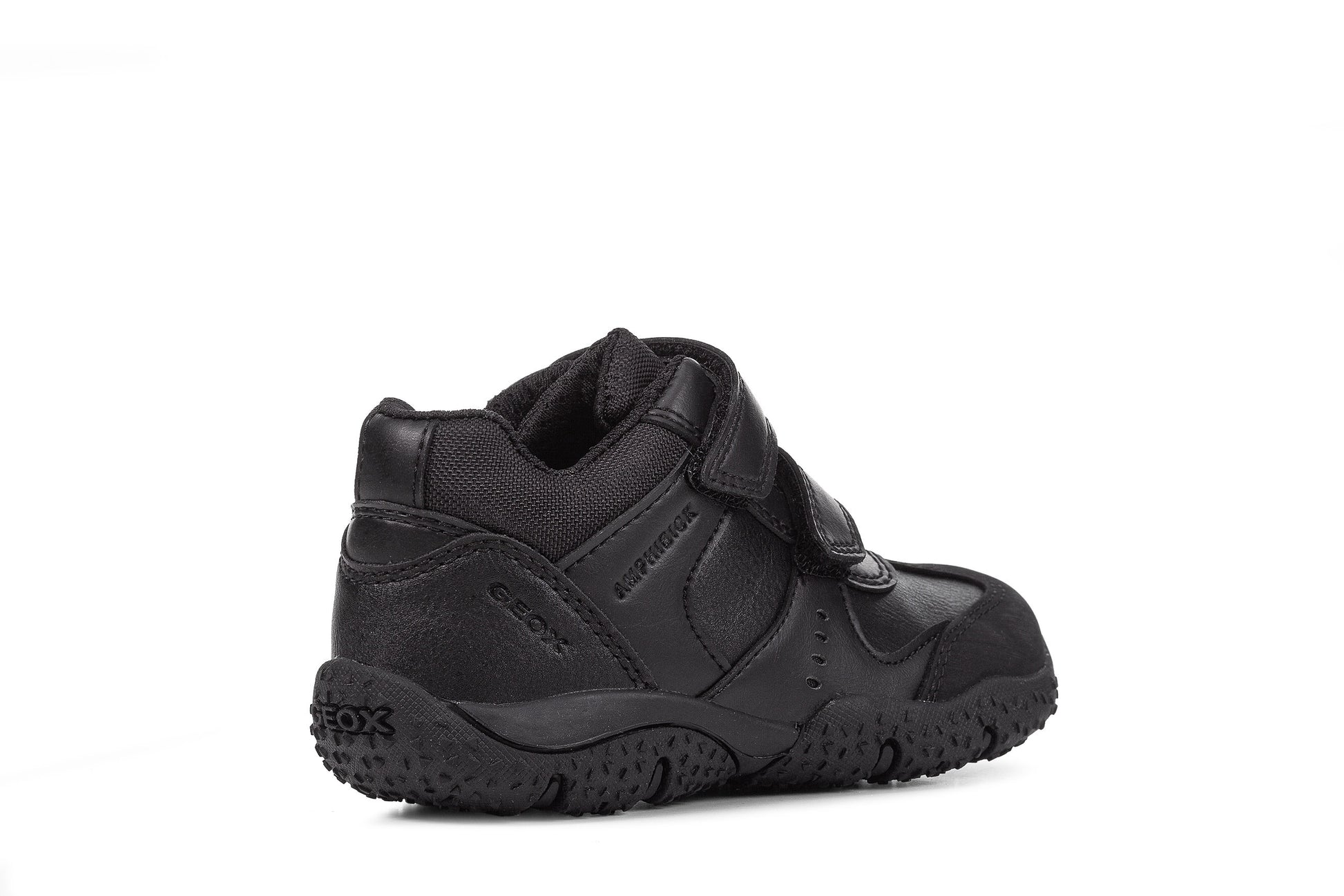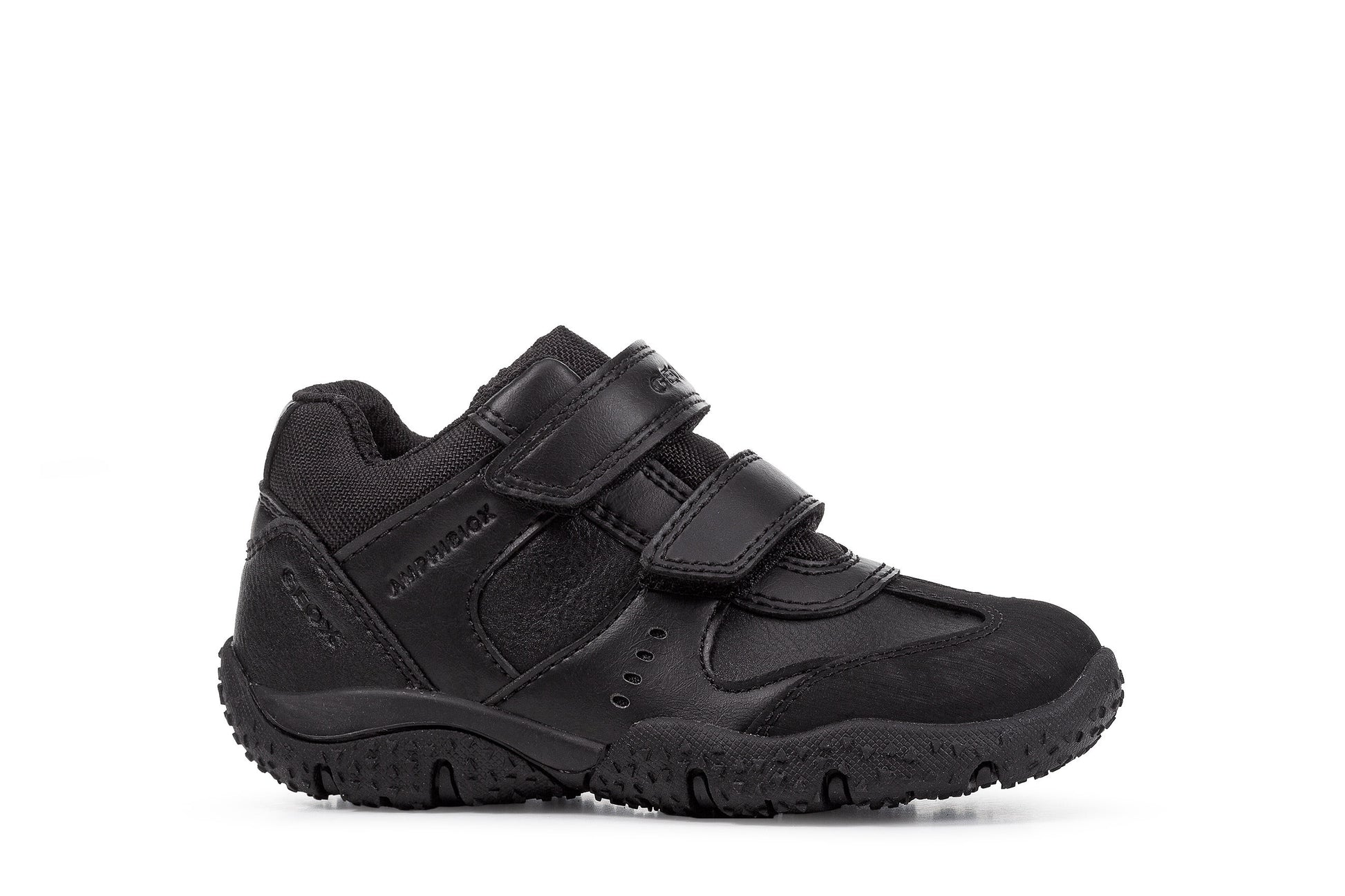 Baltic from Geox is a boy's waterproof black school shoe with a leather and synthetic upper with sporty styling. Double adjustable rip tape straps, padded ankle collar, warm textile lining, robust bumper style flexible outsole. Geox Amphibiox waterproof technology with Respira breathable outsole.