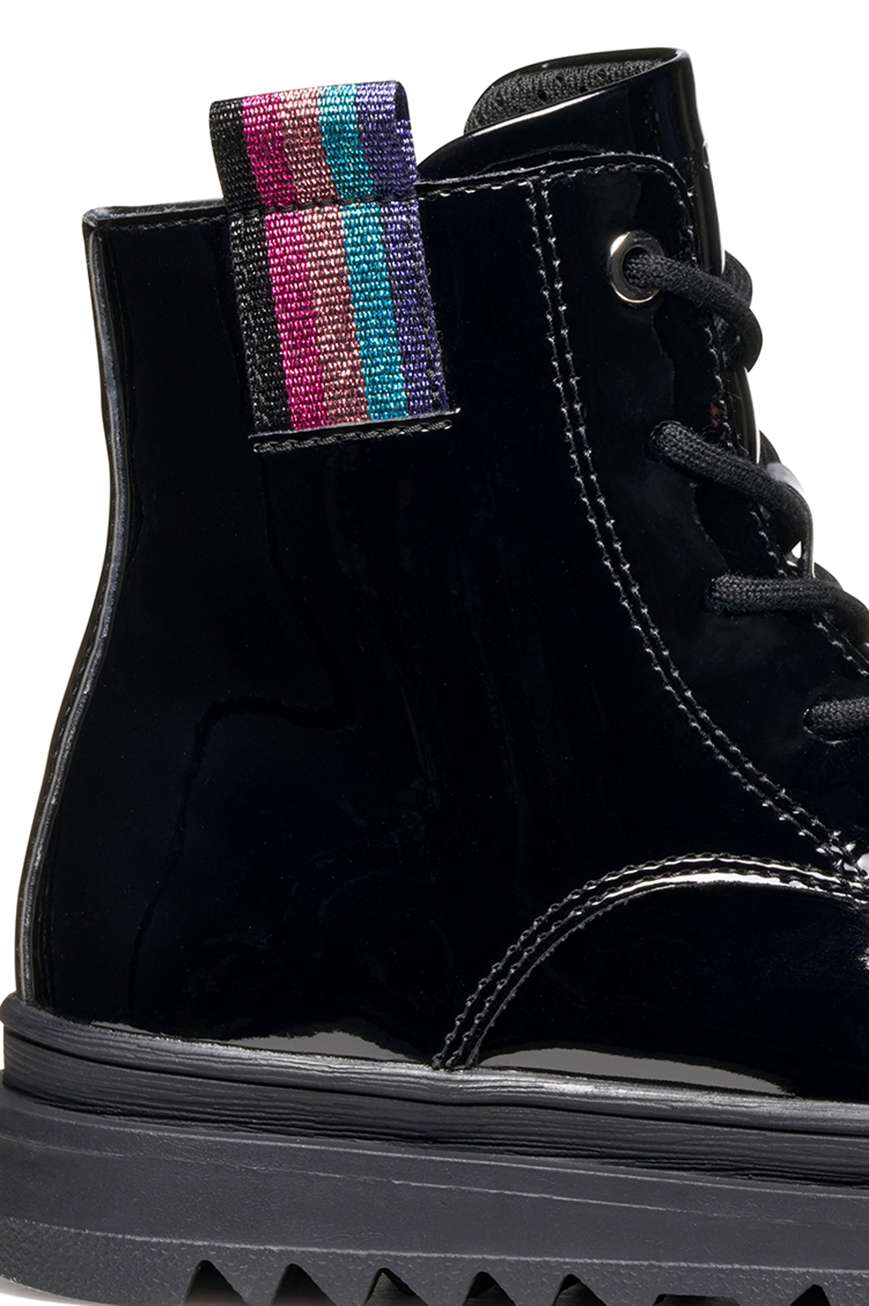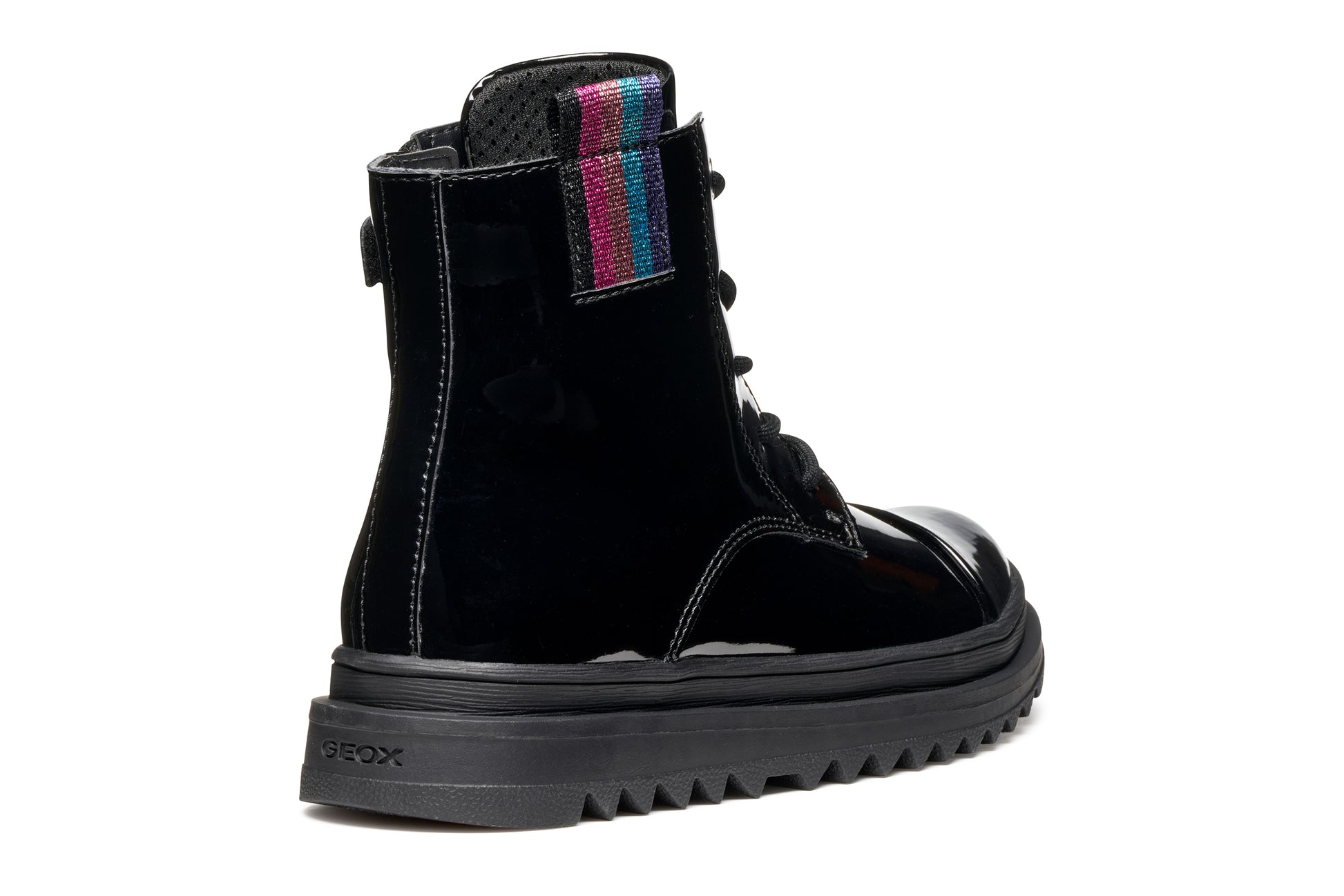 The Geox Gillyjaw Girls Black Patent Lace Boot combines a sturdy chunky sole with a cheerful rainbow motif, making every walk a fun and comfy adventure. Crafted with shiny patent leather, these boots add a playful pop to any outfit while providing reliable support for energetic days.