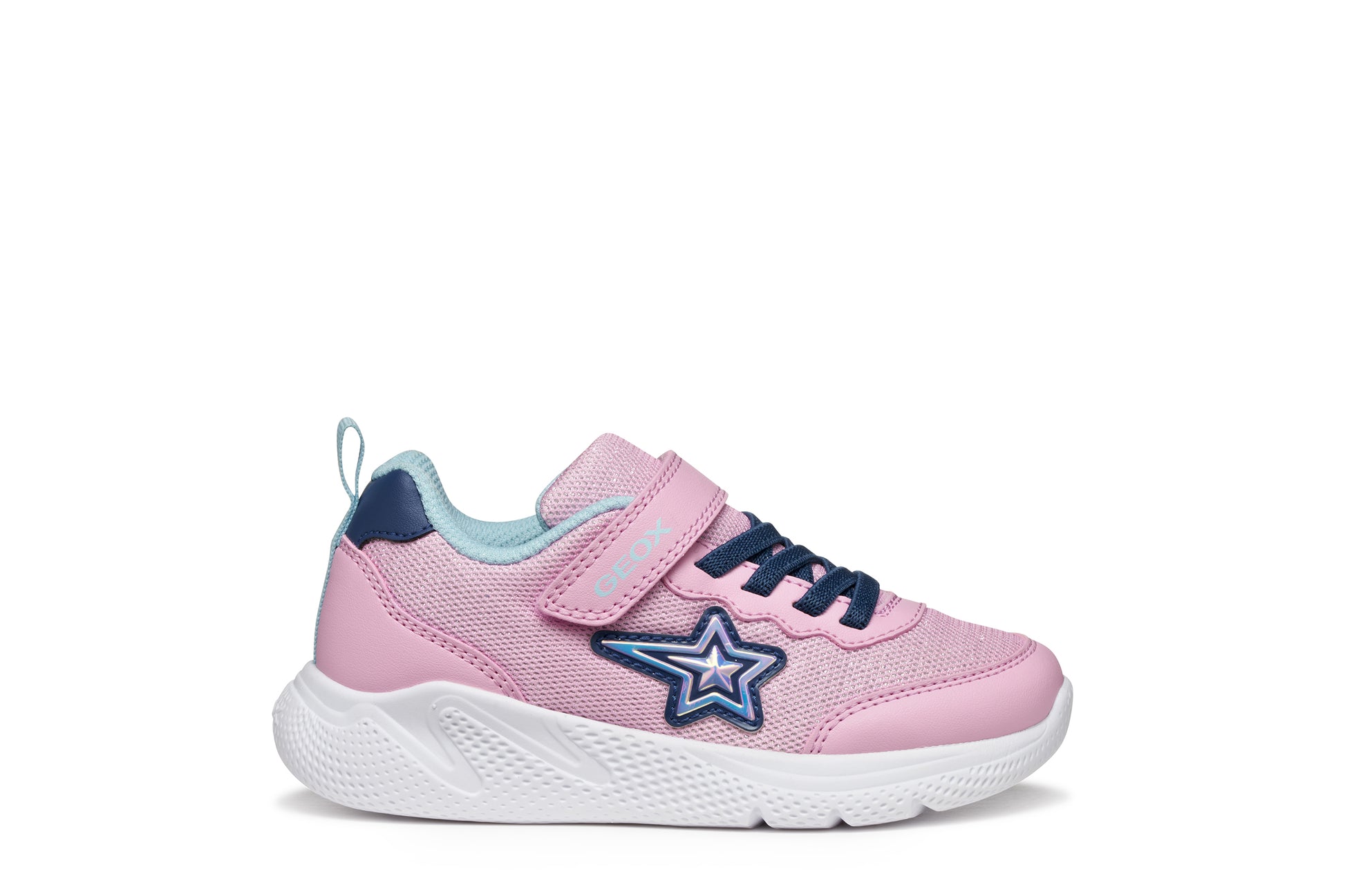 These Geox Sprintye trainers sparkle with a bright upper featuring a delightful blue star motif, perfect for adding playful charm to any outfit. Designed for girls who love a bit of shine, they offer both style and comfort with breathable soles that keep feet happy all day long. A fun and vibrant choice for energetic adventures!