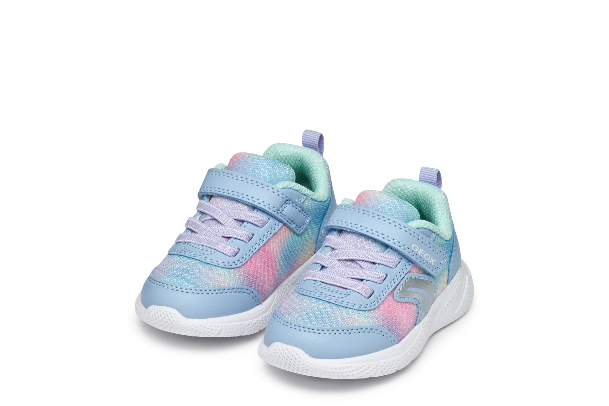 Step into style and comfort with the Geox Sprintye Girls Sky Blue Multicolour Trainer. Designed for toddlers, these trainers feature a convenient rip tape fastening and a breathable sole that keeps feet feeling fresh all day. The light blue color with rainbow accents adds a fun touch to any outfit. Elevate your little one's every step with these lightweight and stylish trainers.