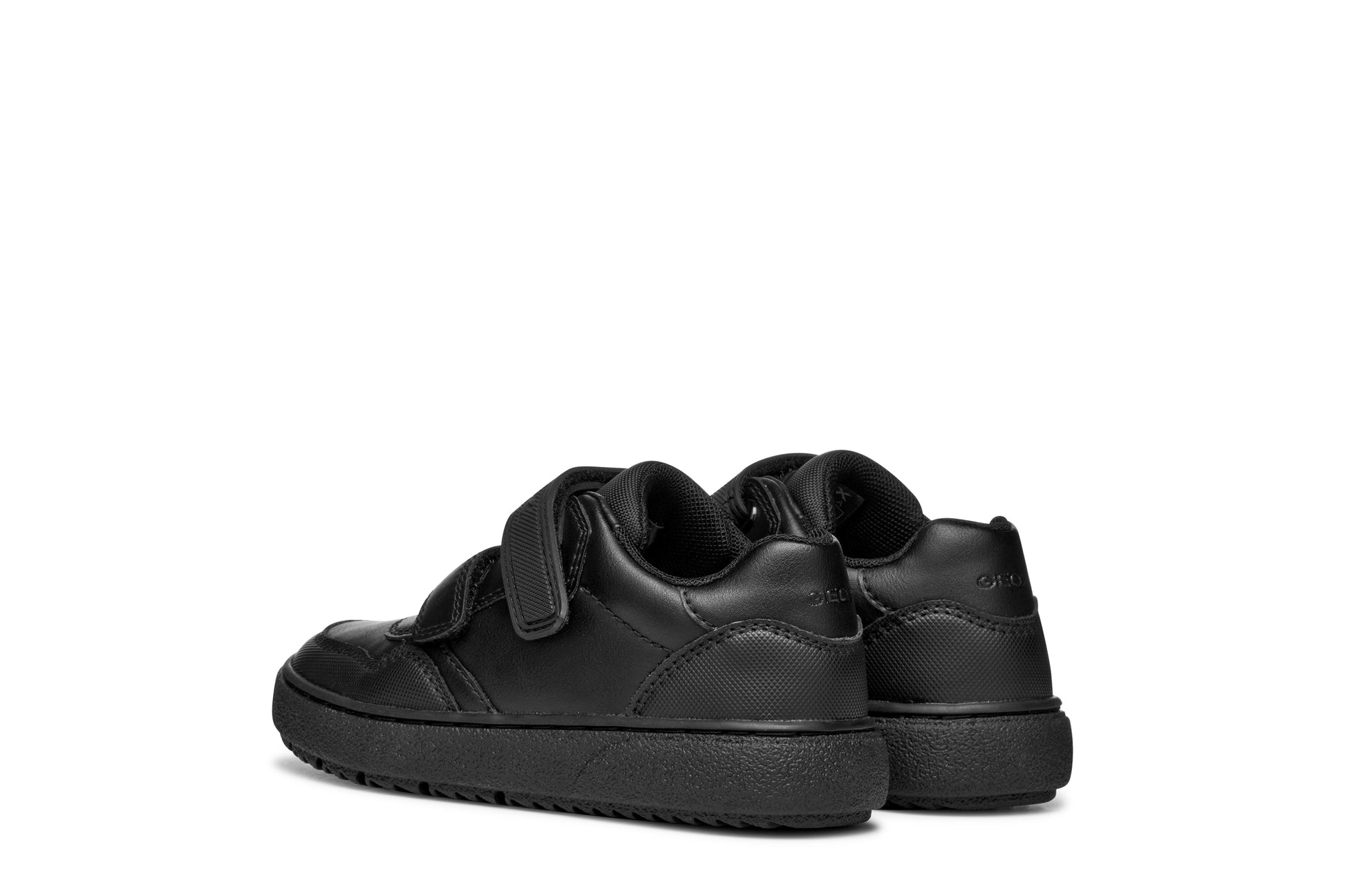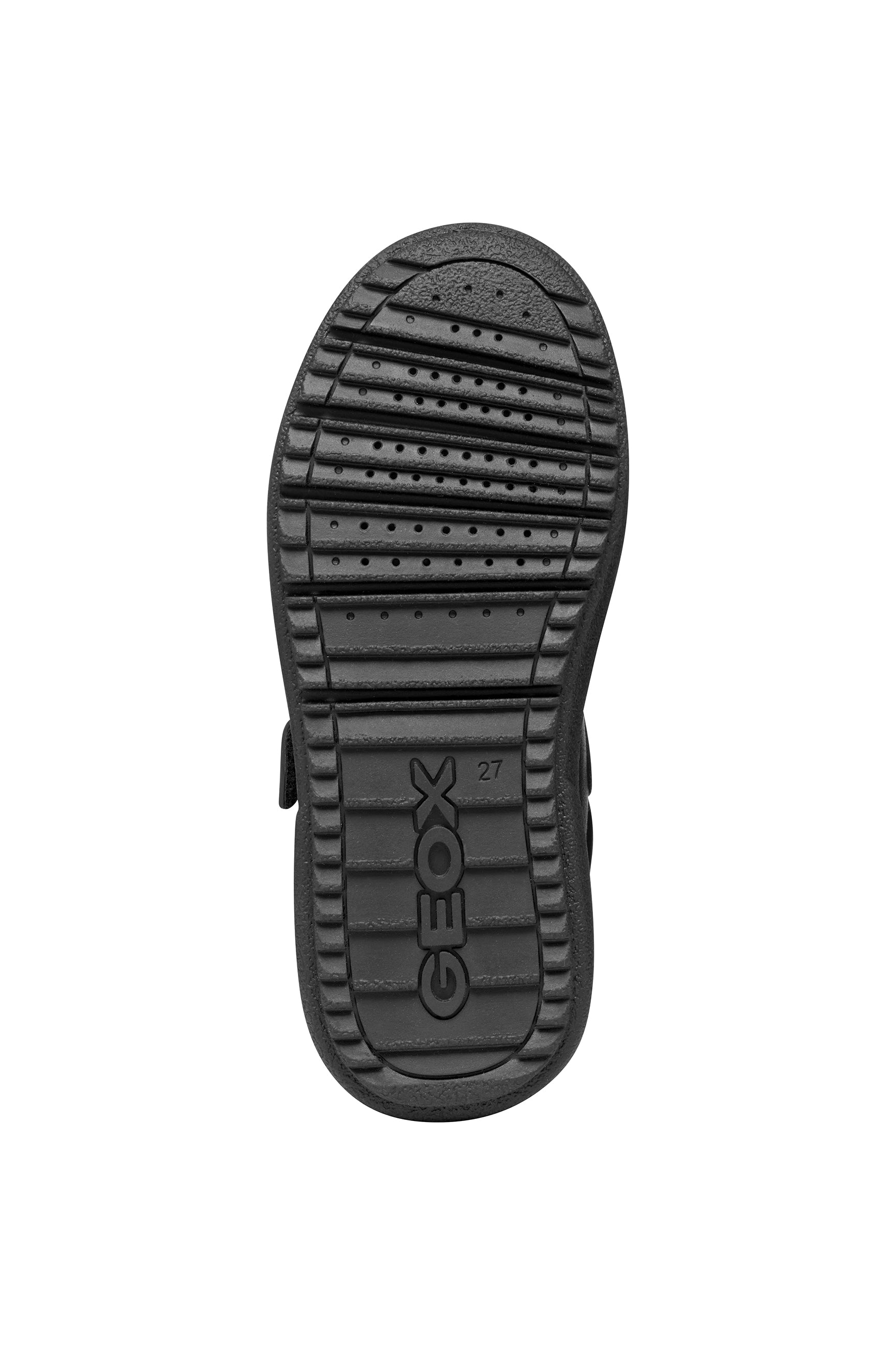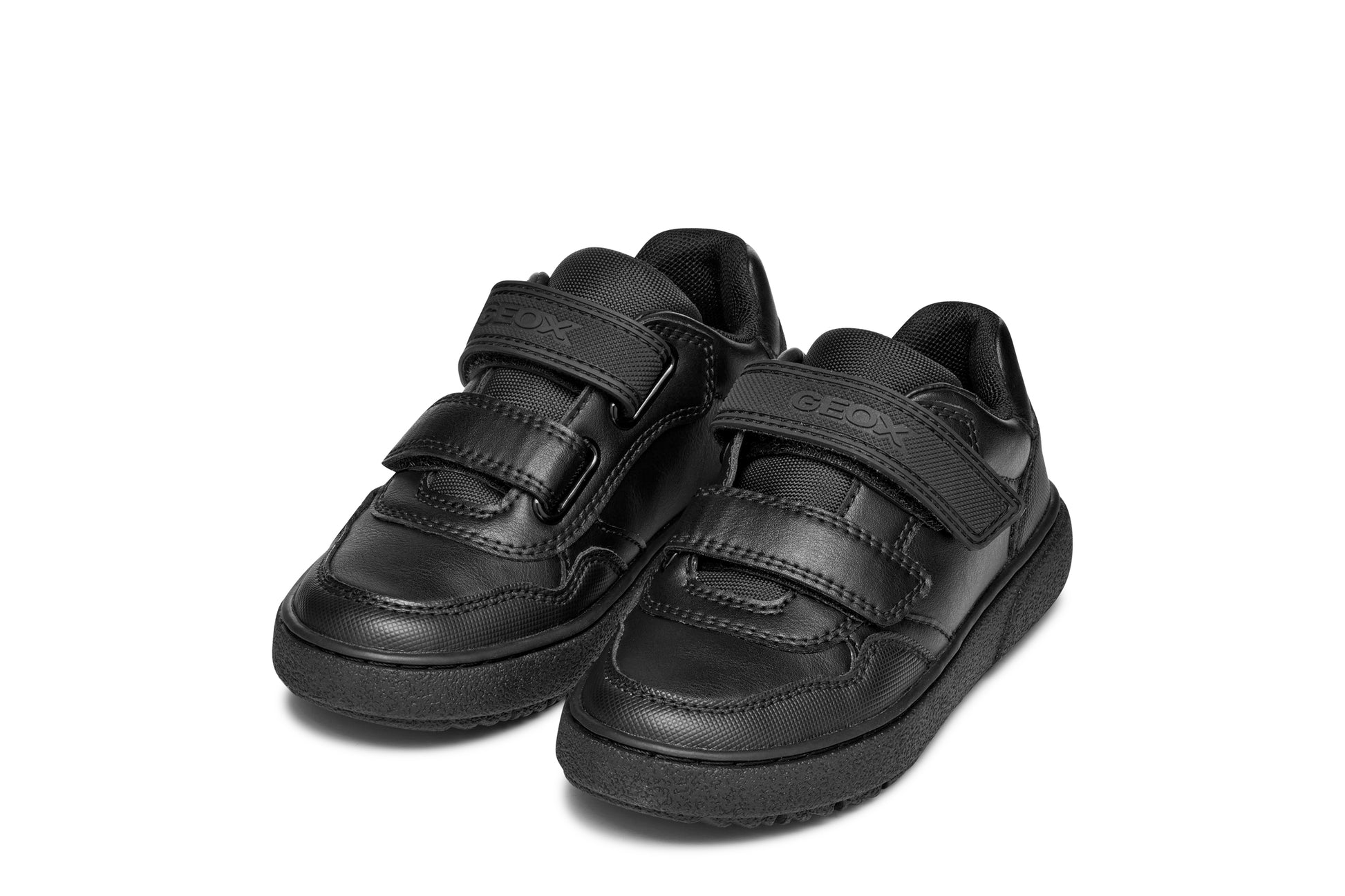 Channel trainer style with the Geox Theleven Boys Black Trainer School Shoe. With a durable black upper complete with breathable textile panels, this a great choice for kids on the go. A double rip tape strap closure means the shoe is quick and easy to get on and off. A padded insole and generous sole unit keeps the feet comfortable and provides durability.