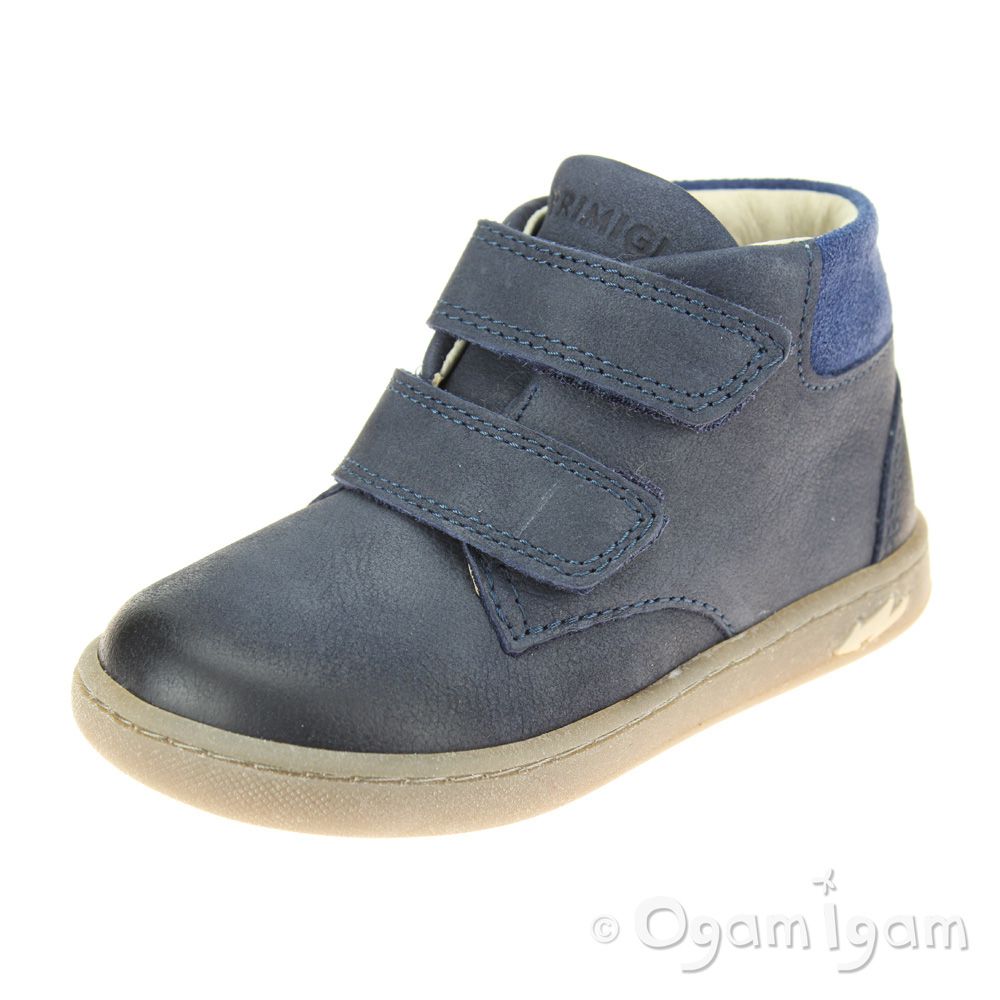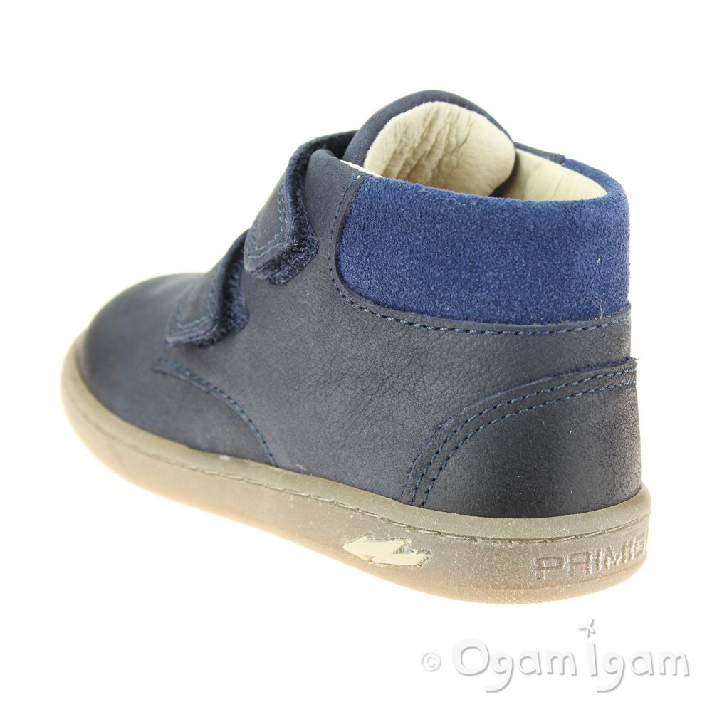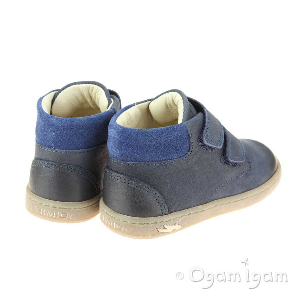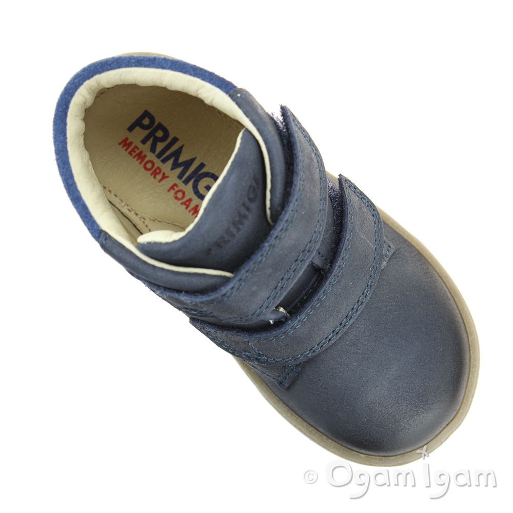 The Primigi '44038' style is a soft, supple boys boot in blue leather. The style features a smooth navy leather upper with a contrasting bright blue suede ankle cuff. The shoe is secured with two rip tape straps, one over the foot and a second around the ankle for adjustability. Inside the boot is lined in soft leather and features a leather memory foam insole with added arch support. The shoe is finished off with a lightweight synthetic sole unit.