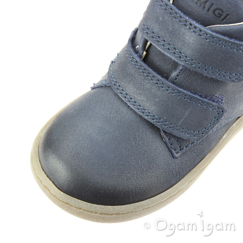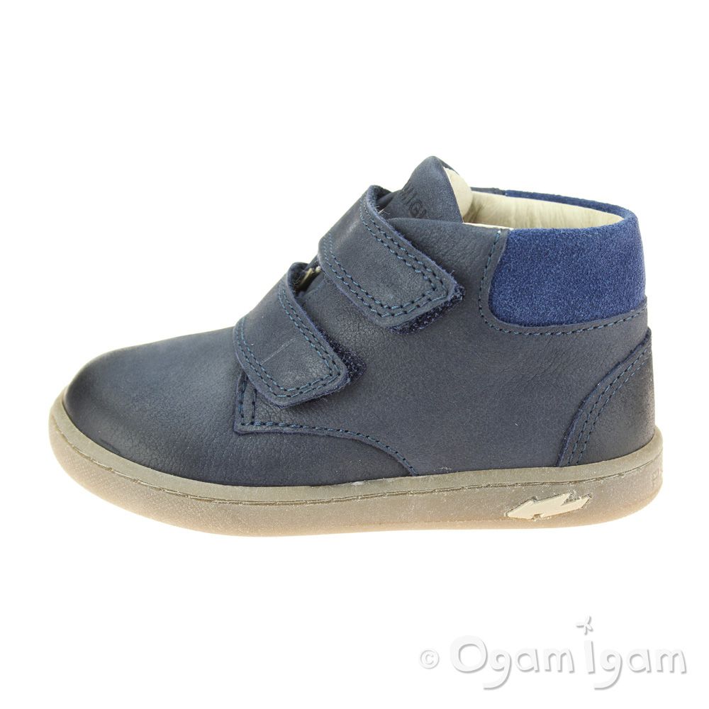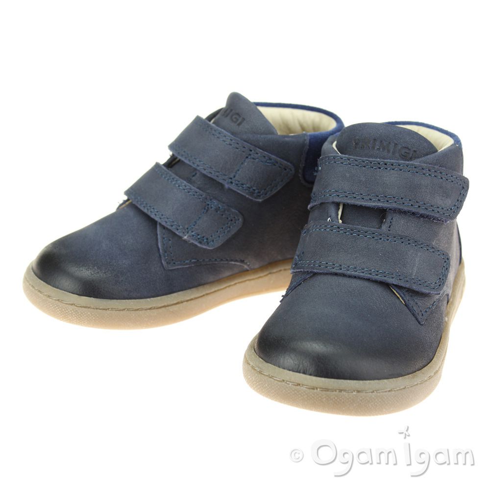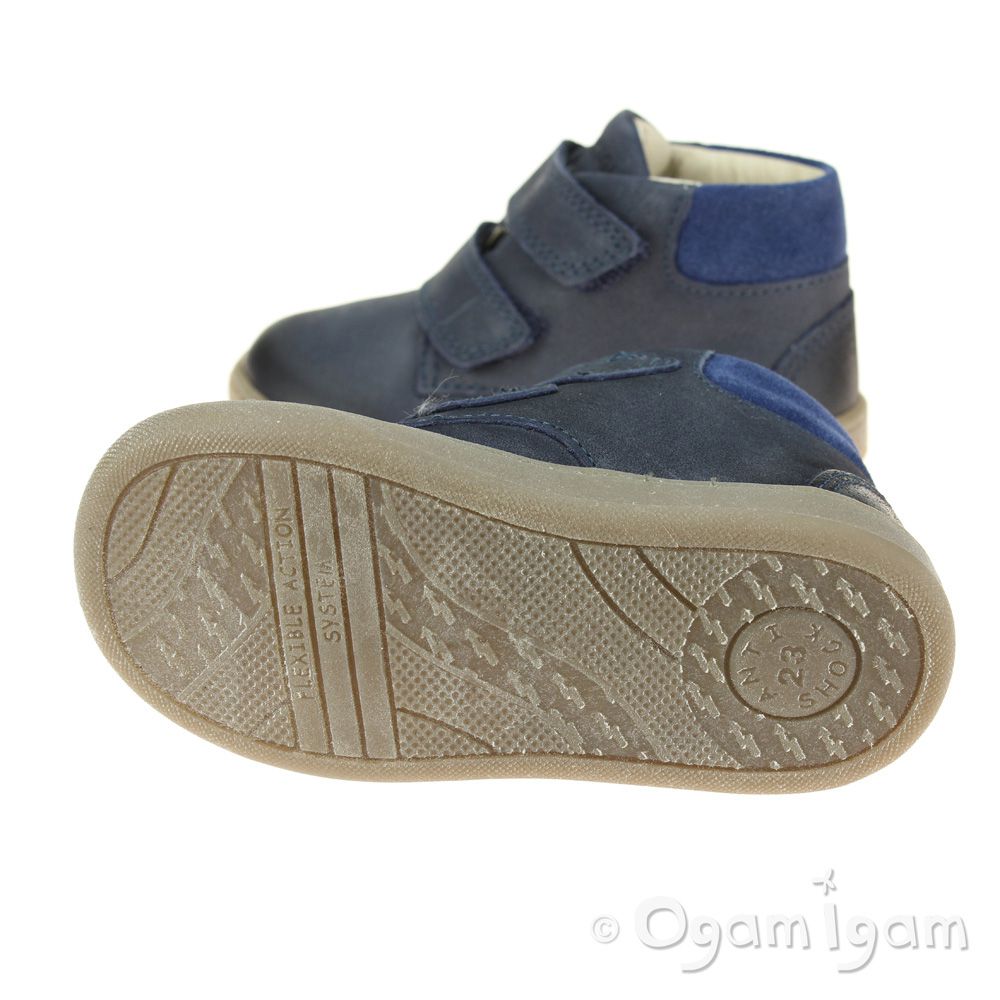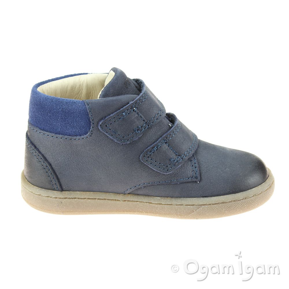The Primigi '44038' style is a soft, supple boys boot in blue leather. The style features a smooth navy leather upper with a contrasting bright blue suede ankle cuff. The shoe is secured with two rip tape straps, one over the foot and a second around the ankle for adjustability. Inside the boot is lined in soft leather and features a leather memory foam insole with added arch support. The shoe is finished off with a lightweight synthetic sole unit.