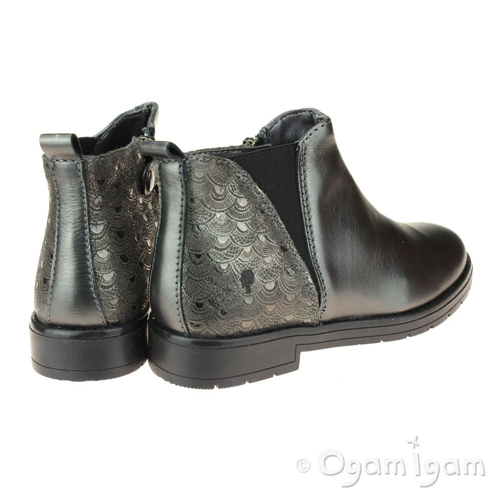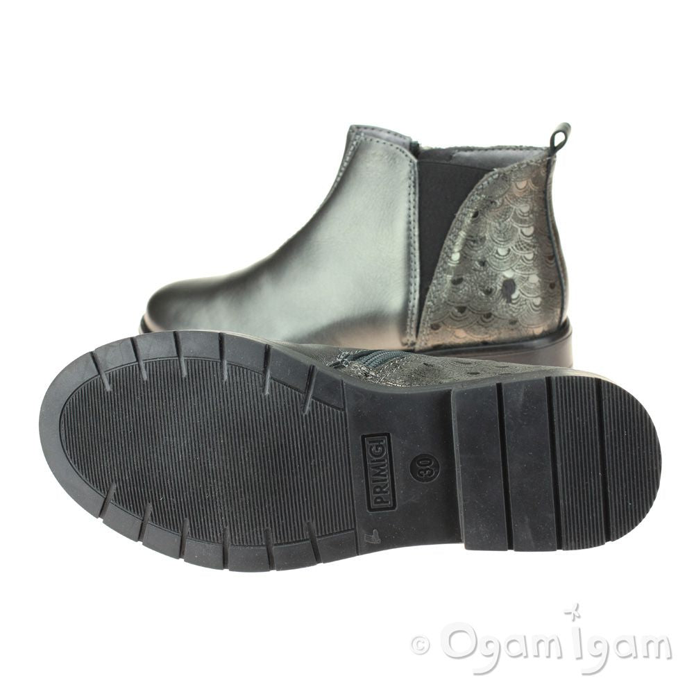 The Primigi ‘44417’ girls ankle boot is a sleek, all black style in a smooth, soft leather upper. The Chelsea style boot has an elastic side panel for a traditional look but with a fun metallic patterned heel. The shoe is secured with a full-length side zip for an easy on off. Inside the boot has a removable leather insole for breathable comfort. A sturdy black sole unit finishes the boot with great grip underfoot.