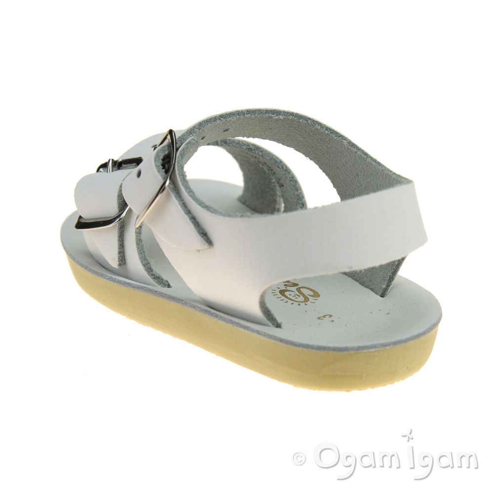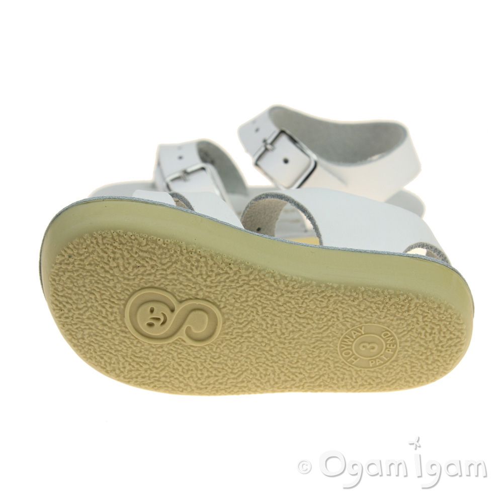A mini version of Salt-Water sandals for youngsters in white leather. With added flex over the toe this extremely hard wearing little sandal is the perfect starter pair for your tiny adventurer. Open toe and open heel with a fixed heel strap and double adjustable front straps. The entire Sun-San range comes on a spongy urethane sole with rust proof buckles. They can be worn in the water and put through a cool machine wash.