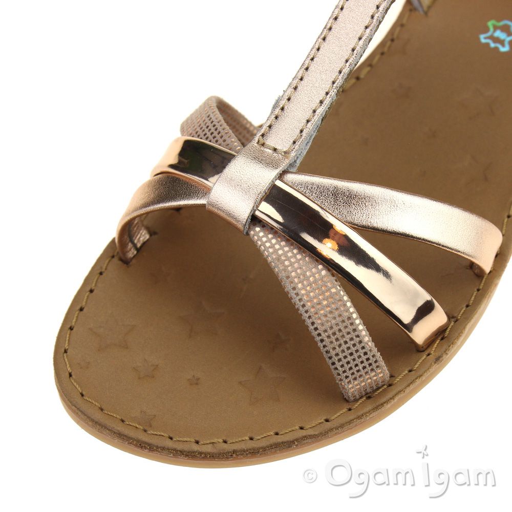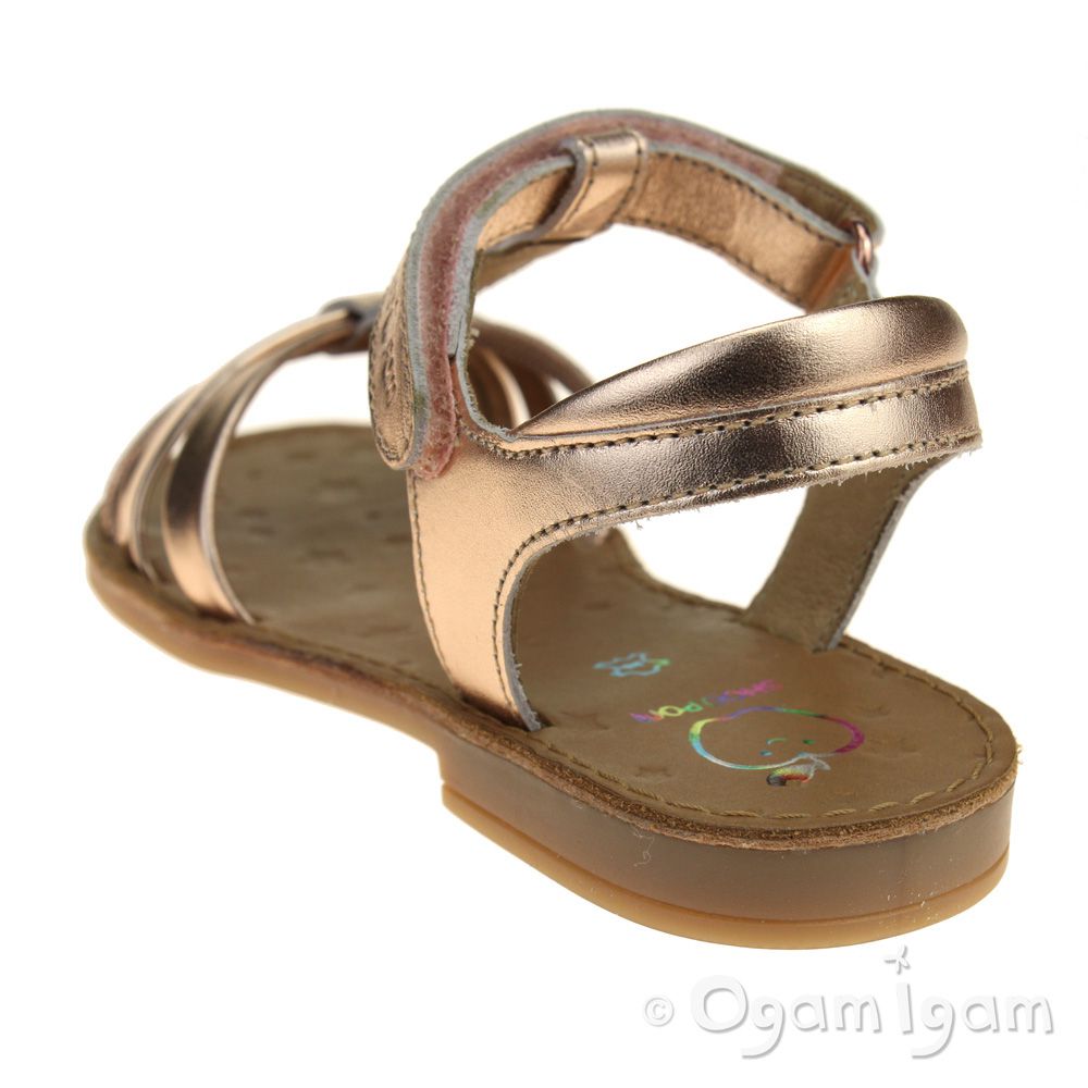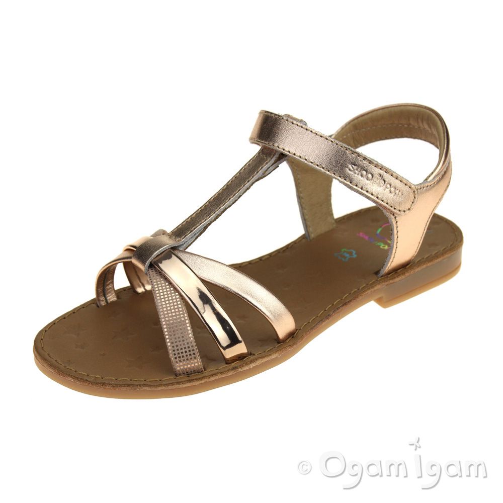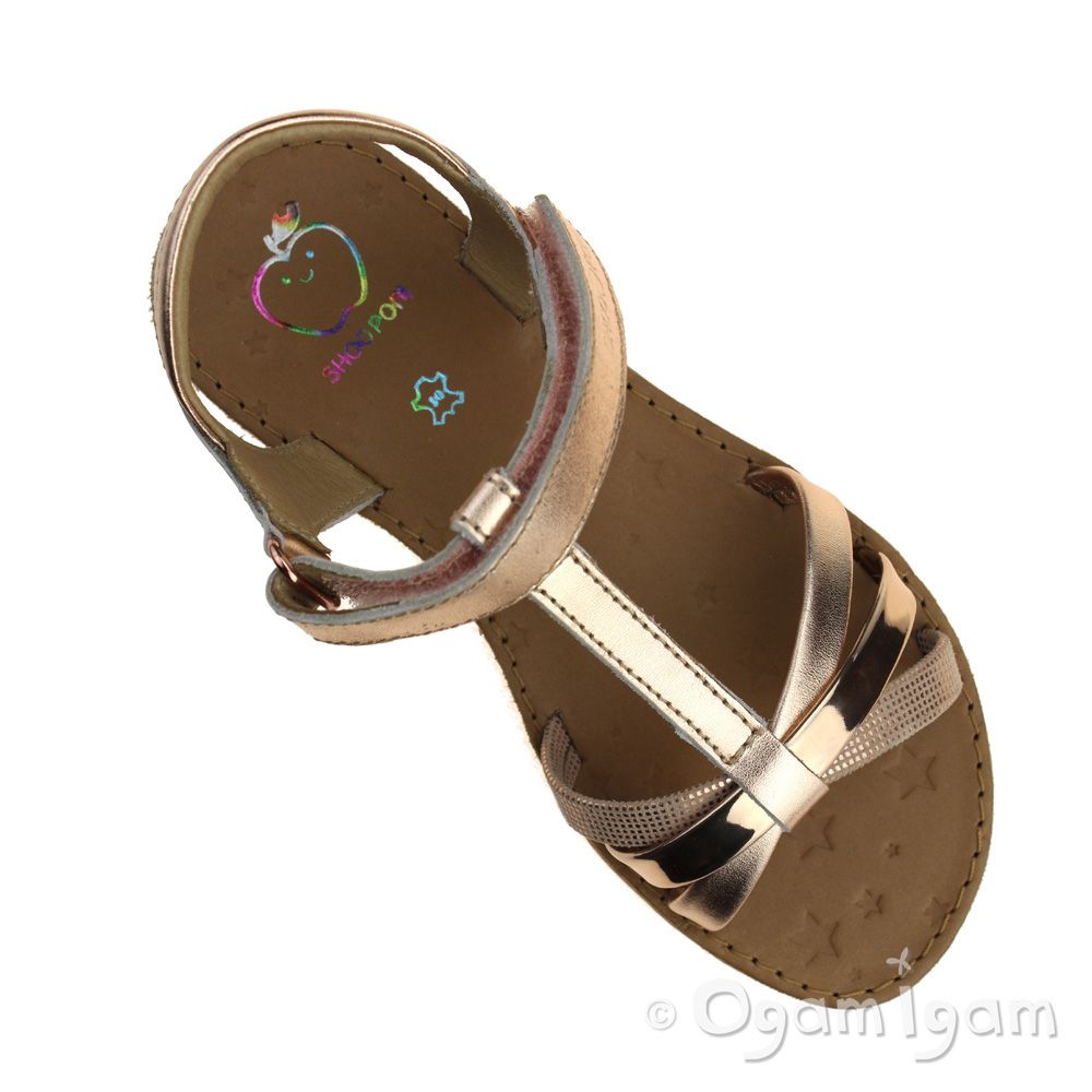 Sweet and sophisticated, the Shoo Pom Happy Salome is an elegant girls sandal in a bright metallic copper leather. The shoe features a padded ankle collar and an adjustable rip tape strap with triple straps over the toes. A mixture of leather textures from a smooth leather to a patent liquid cooper give the sandals a glamorous feel. An all leather insole onto of a rubber style sole unit completes the shoe.