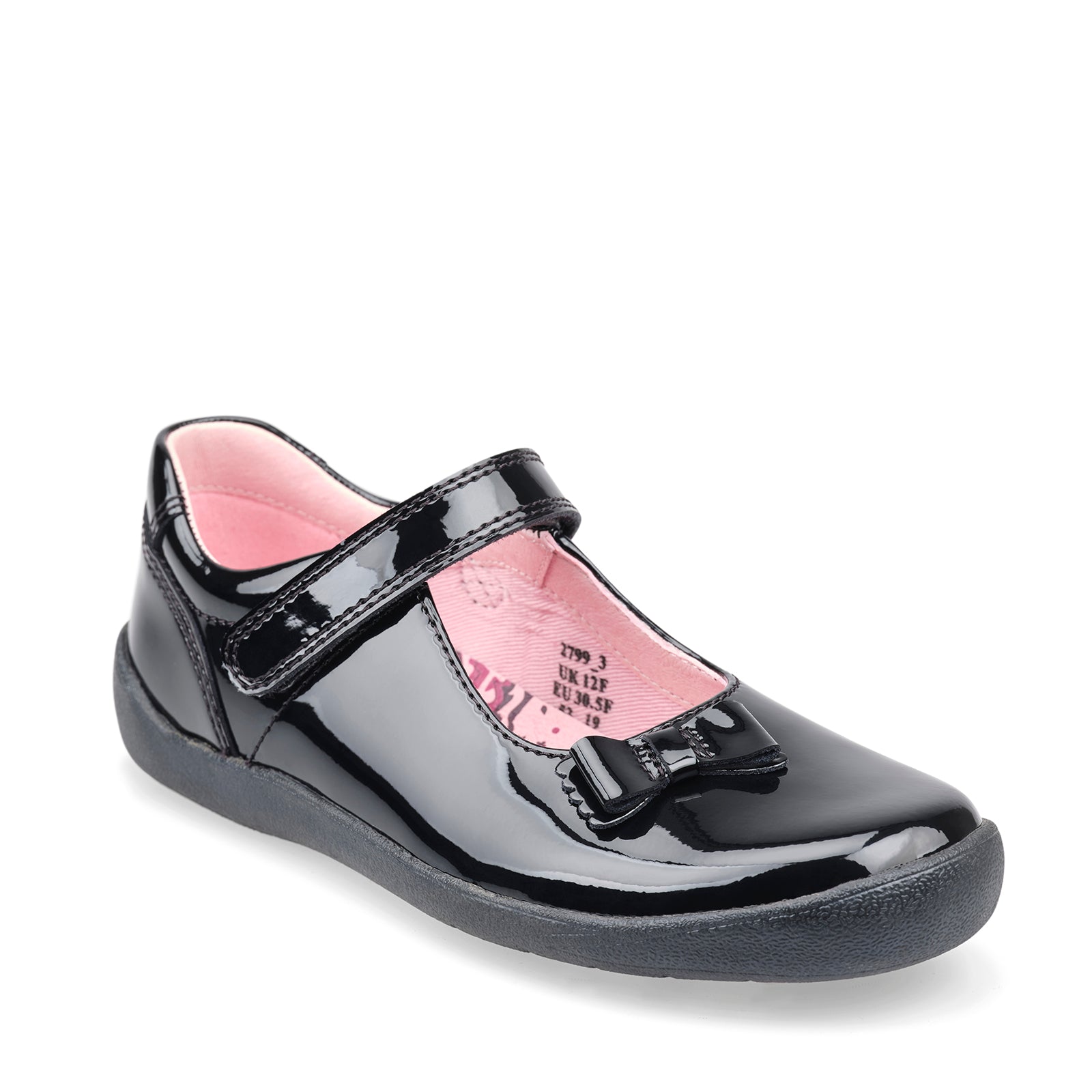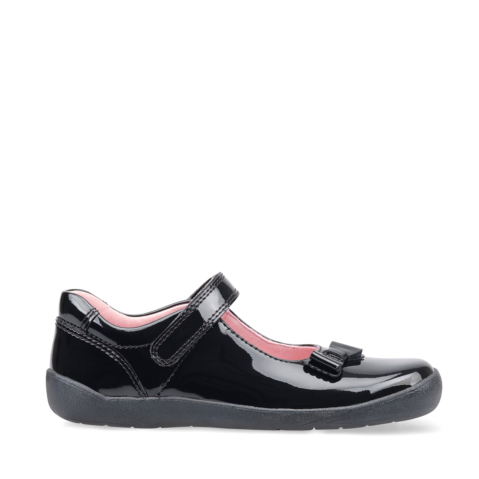 The sturdy Mary-Jane style shoe has a shiny black patent upper with a girly patent bow. The style is secured to the foot with a single rip tape strap across the ankle that holds the foot securely in place. The Giggle school shoe is finished off with a supportive sole unit that wraps up over the toe for protection against scuffing.