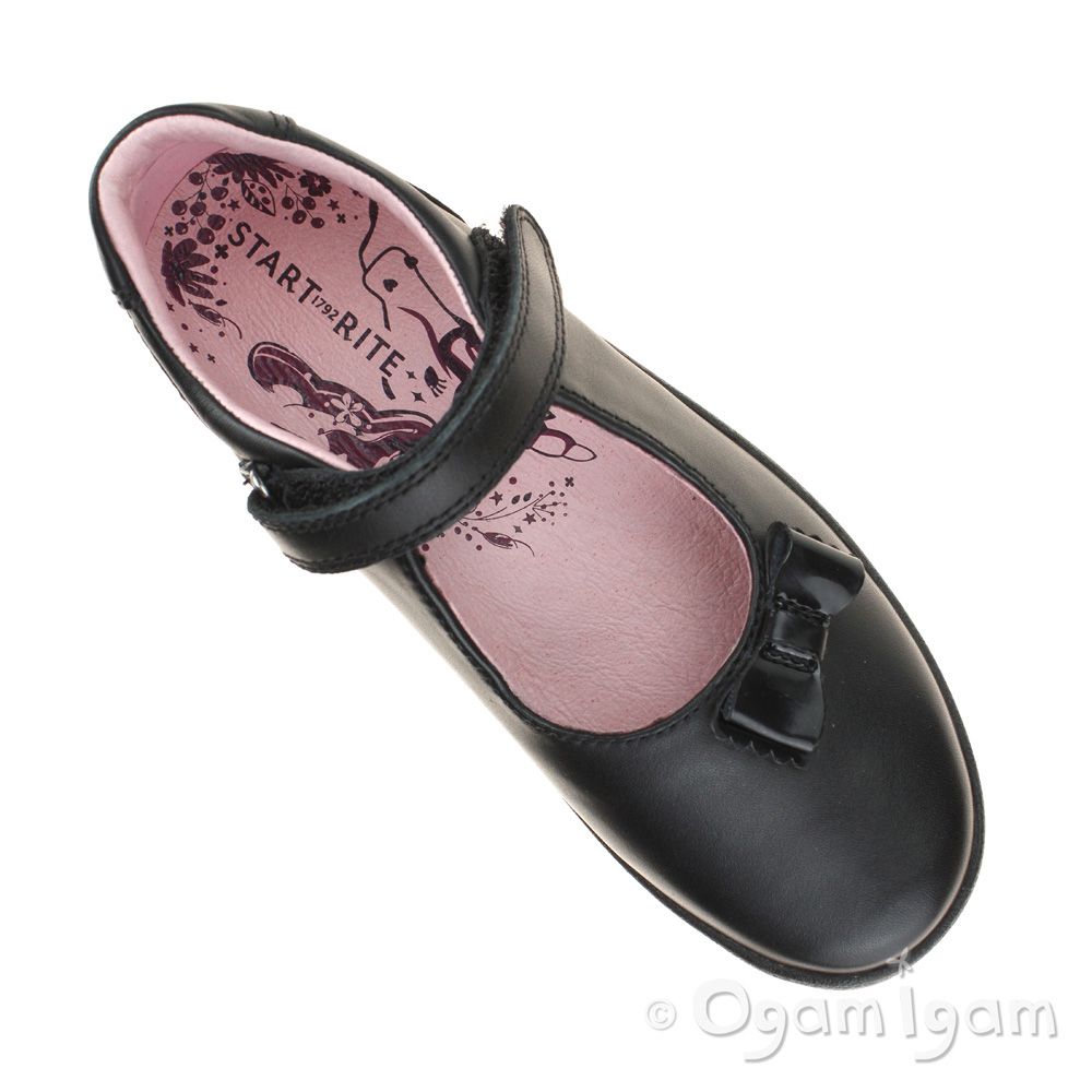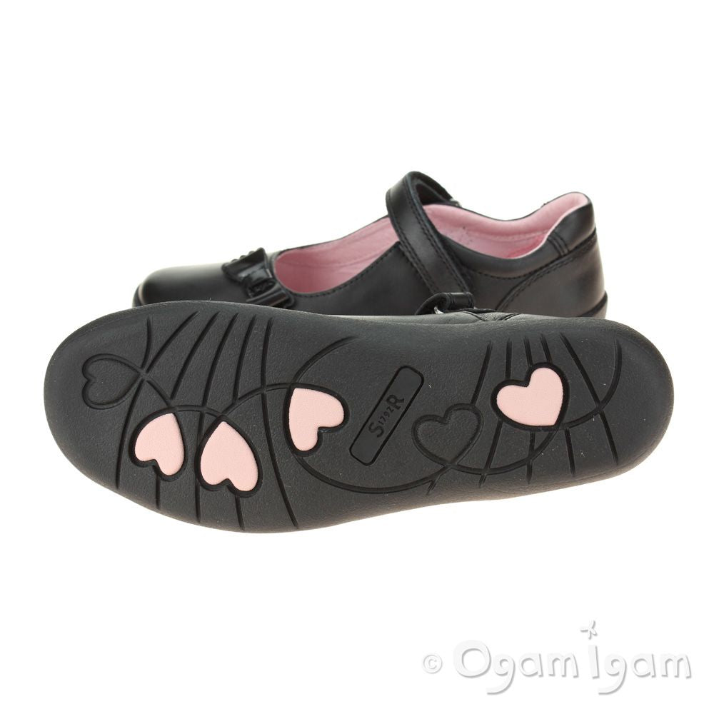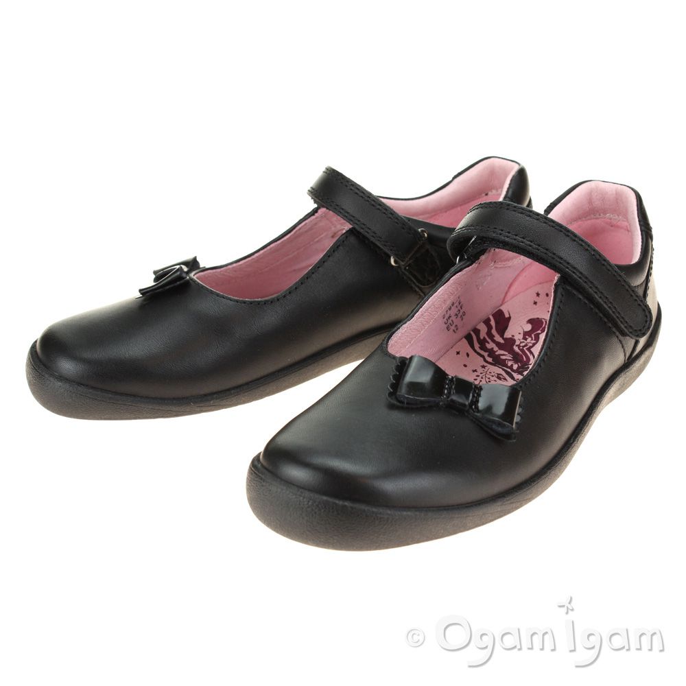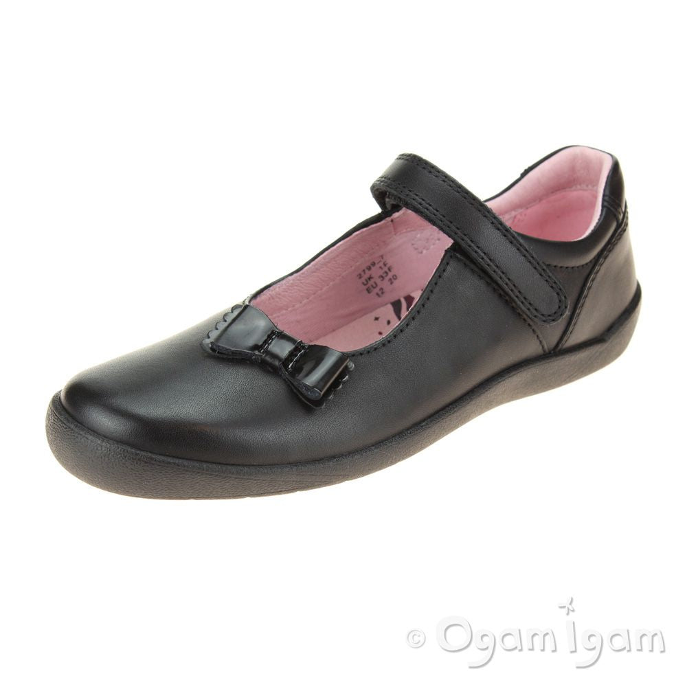 The sturdy Mary-Jane style shoe has a smooth black leather upper with a girly patent bow. The style is secured to the foot with a single rip tape strap across the ankle that holds the foot securely in place. The Giggle school shoe is finished off with a supportive sole unit that wraps up over the toe for protection against scuffing.