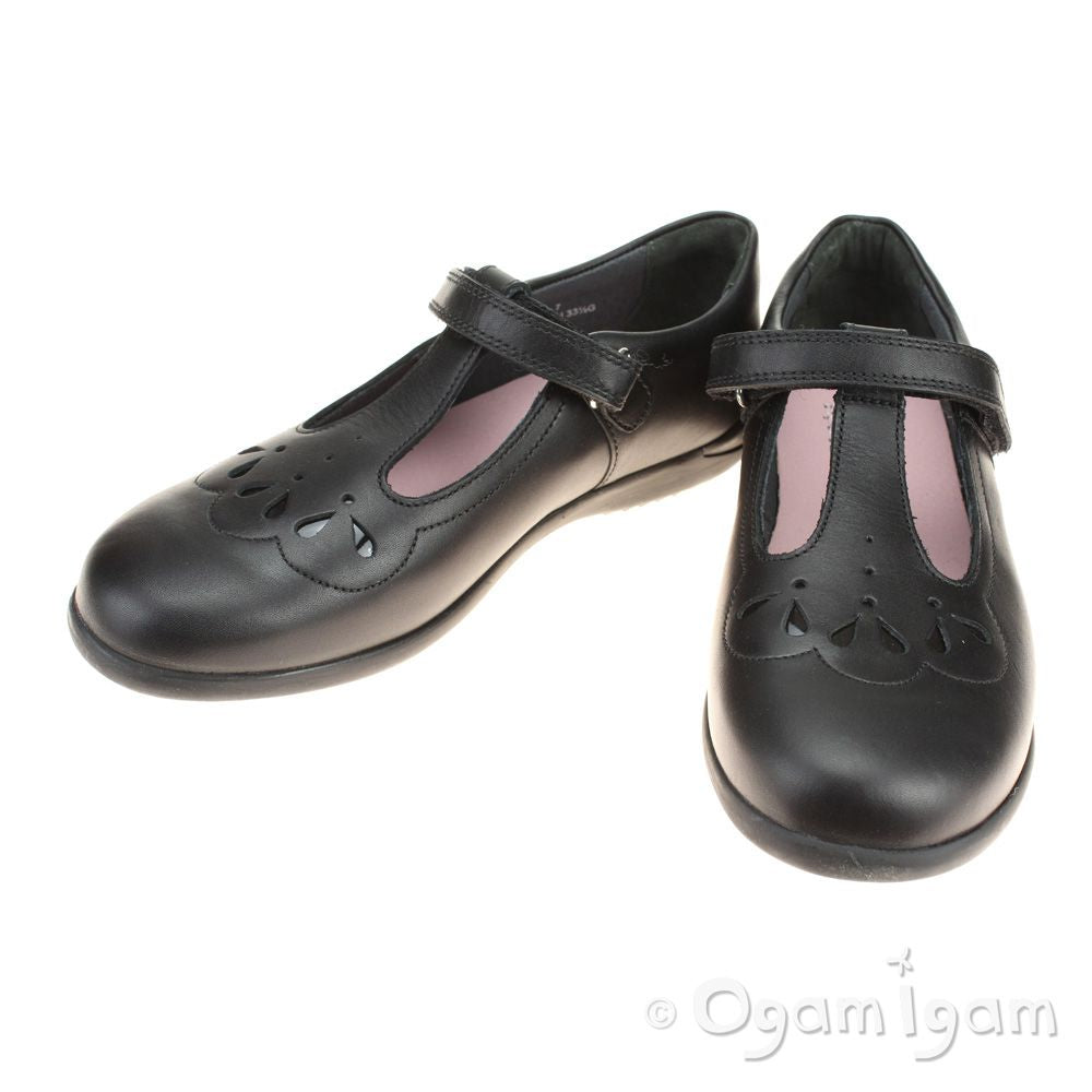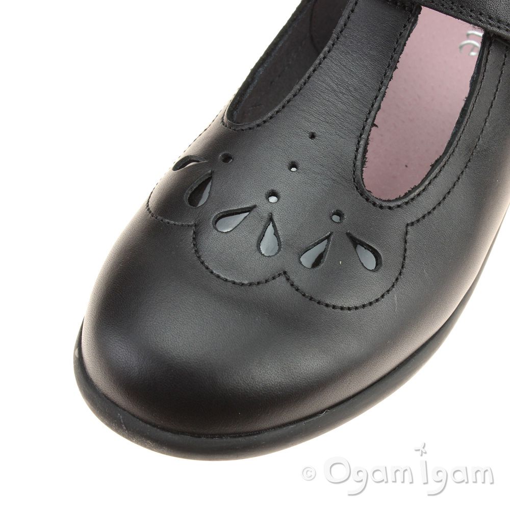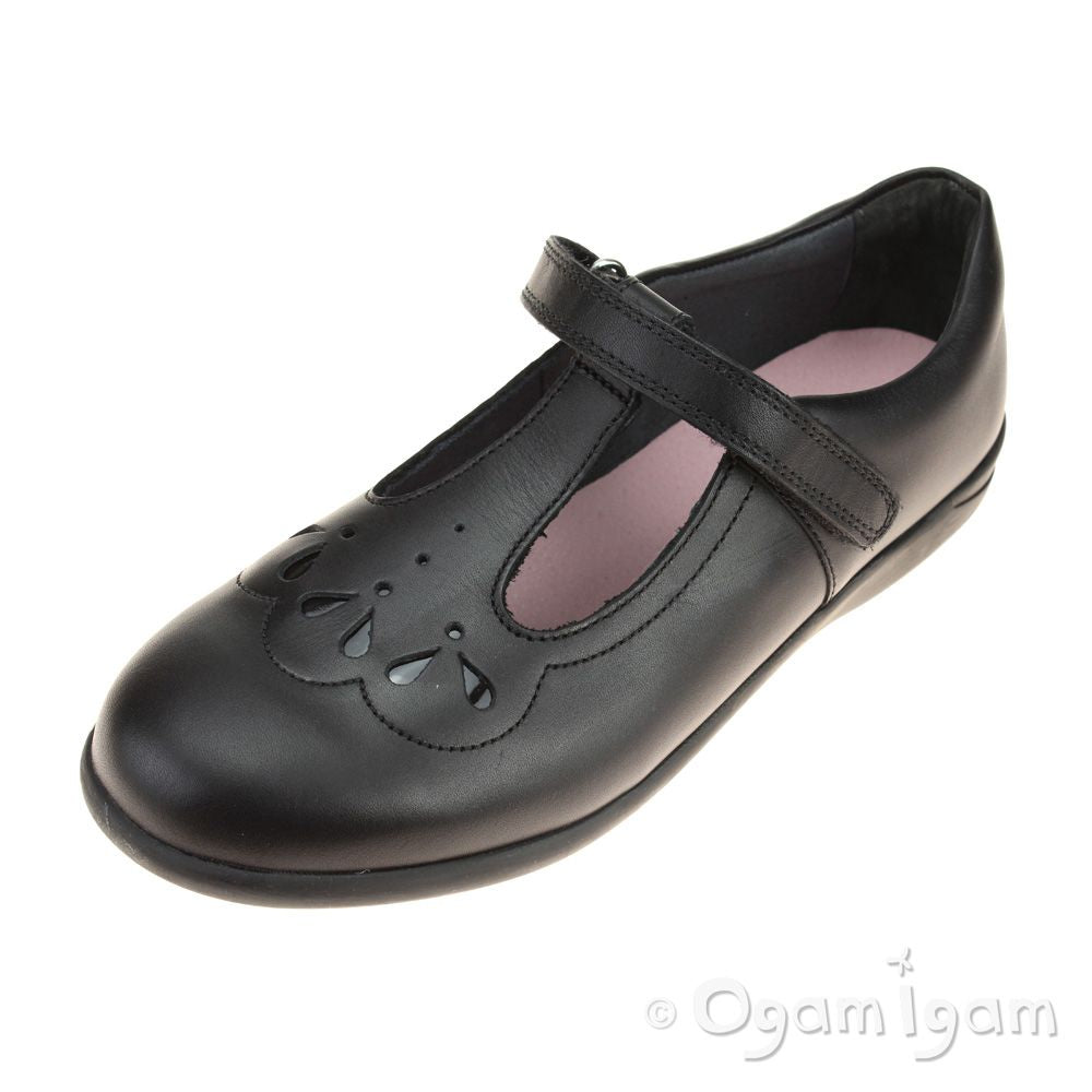 The Poppy style from Start-rite is a fantastic traditional girls school shoe. Made from smooth black leather, the shoe features a T-bar with a single rip-tape strap. There is delicate patent detailing on the toe box and a pale pink lining. The shoe has a leather insole for all day breathability, which sits on top of a durable and sturdy sole unit.