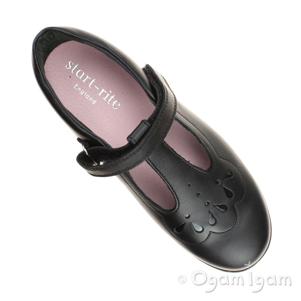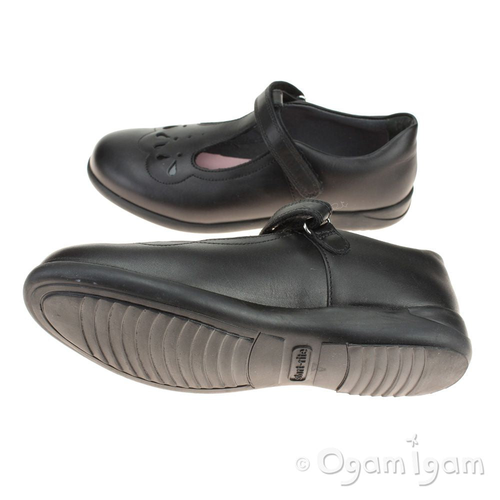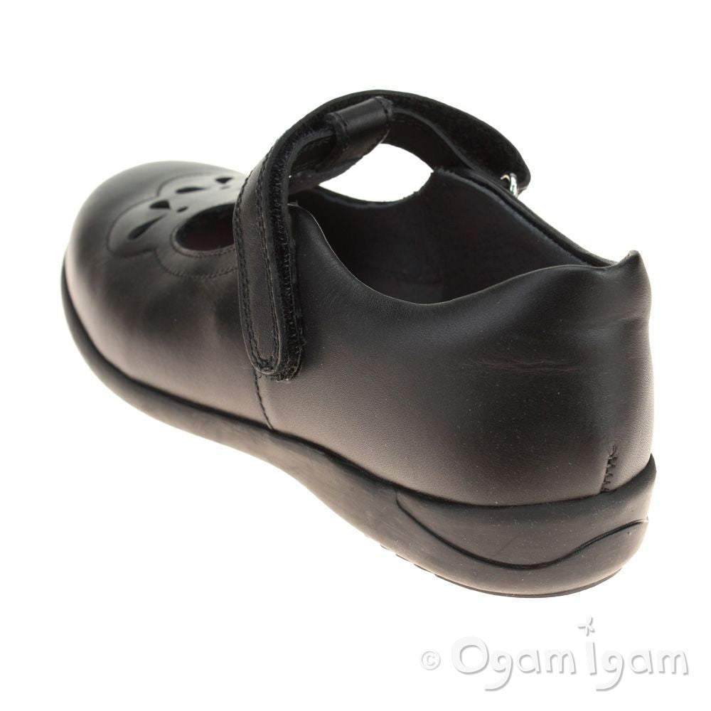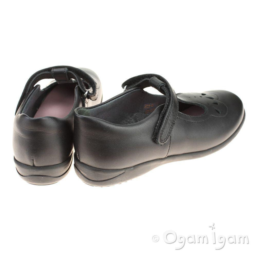 The Poppy style from Start-rite is a fantastic traditional girls school shoe. Made from smooth black leather, the shoe features a T-bar with a single rip-tape strap. There is delicate patent detailing on the toe box and a pale pink lining. The shoe has a leather insole for all day breathability, which sits on top of a durable and sturdy sole unit.