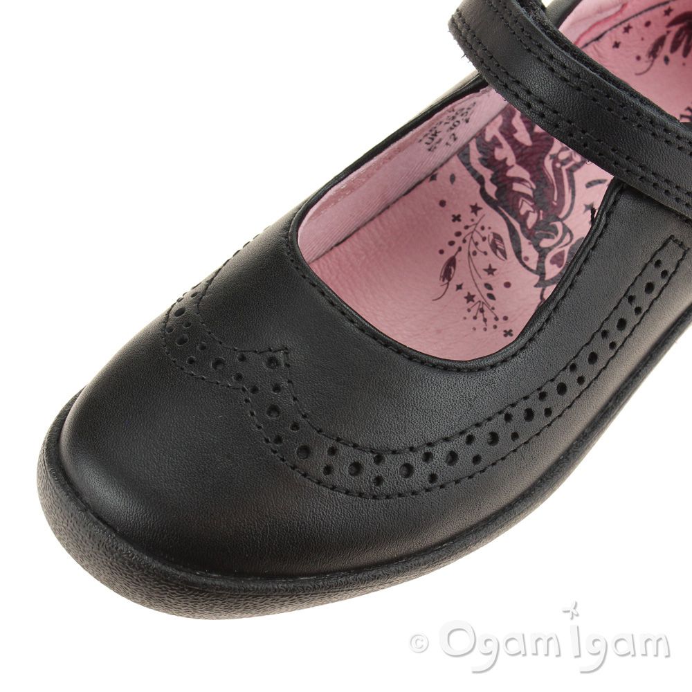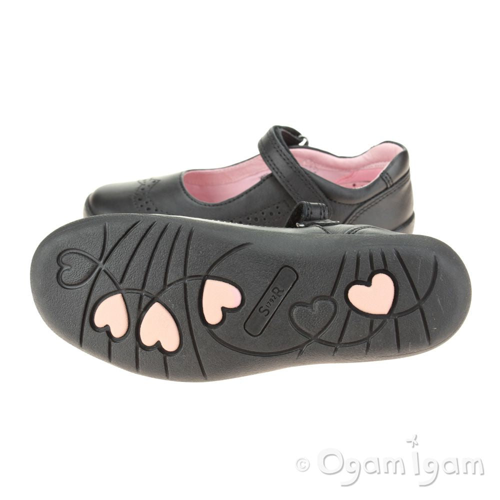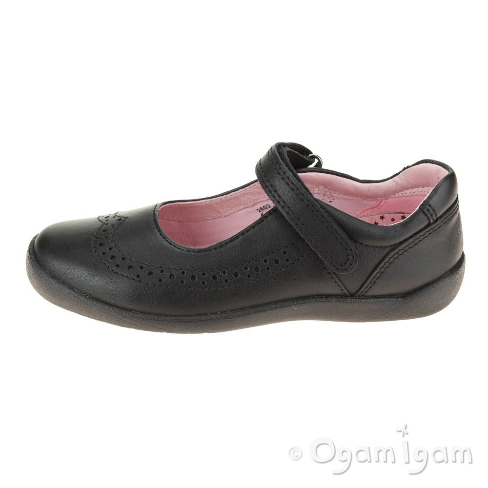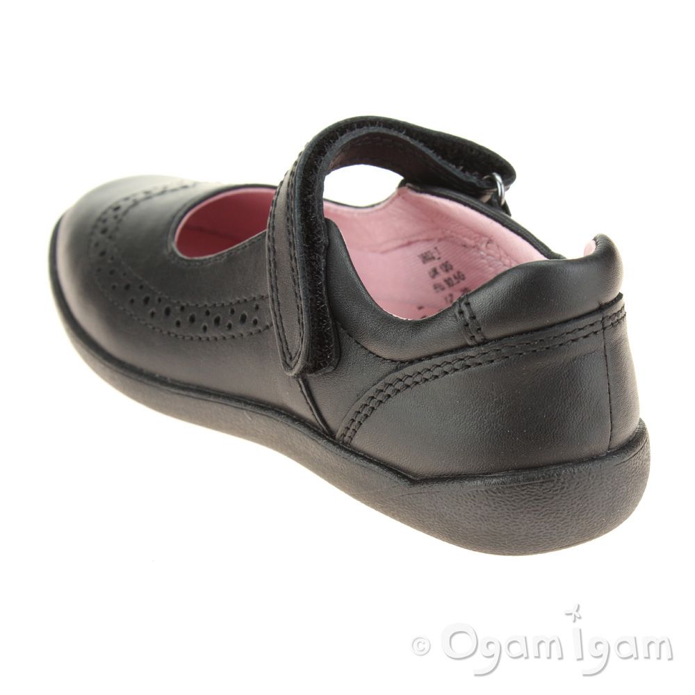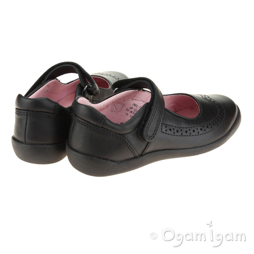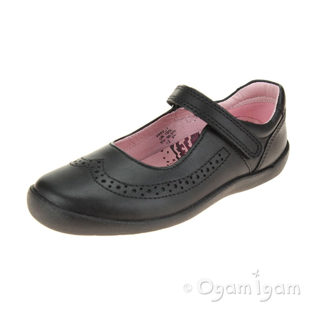The sturdy Mary-Jane style shoe has a smooth black leather upper with classic brogue detailing. The style is secured to the foot with a single rip tape strap across the ankle that holds the foot securely in place. The Spirit school shoe is finished off with a supportive sole unit that wraps up over the toe for protection against scuffing.