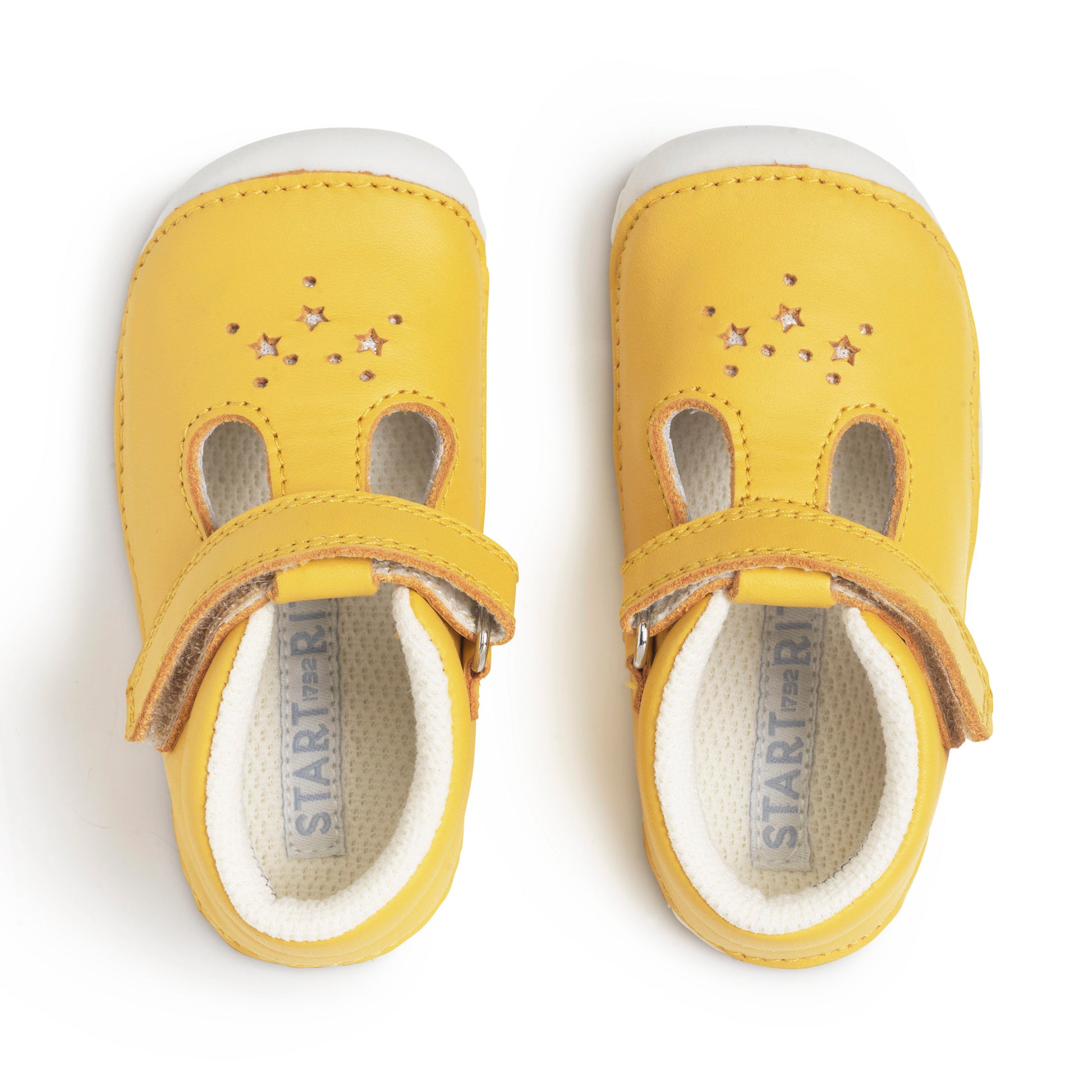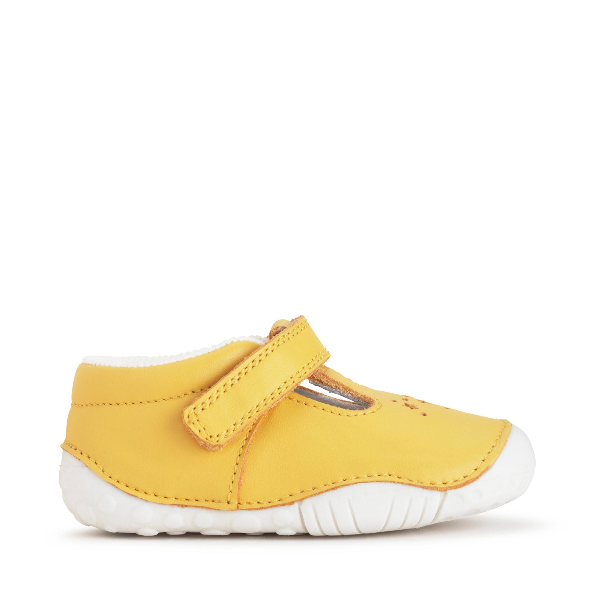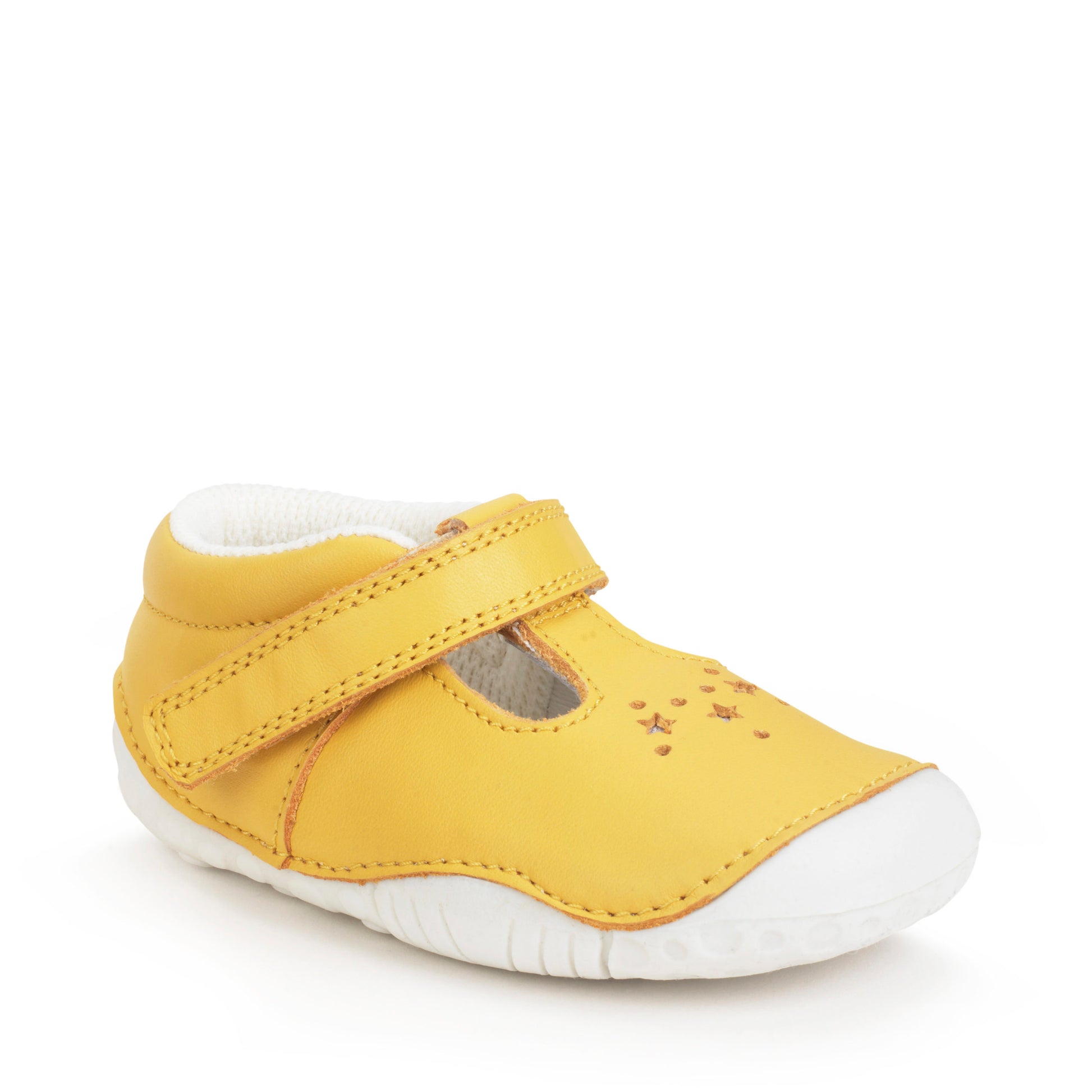 Start-rite Tumble is a fantastic first walker for little girls. Featuring a supportive T-bar style and rip tape strap, the shoe is constructed from soft yellow leather to ensure breathability and flexibility on the feet. With a generously padded collar and malleable sole with front bumper, these shoes maximise comfort to delicate growing feet. Finished off with subtle silvery stars on the toe.