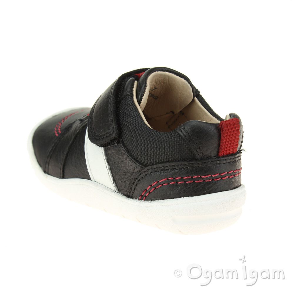 With a firmer, yet still flexible sole, it provides protection as your child develops into a more confident walker. The all leather black upper features contrast red stitching and a sporty side stripe. With a single rip-tape strap and elastic "lace" these are easy to get on and off. The shoe is constructed from an all leather inner sole for comfort and breathability. With a front bumper addition to the sole unit, this is the perfect shoe for exploring the big world in!